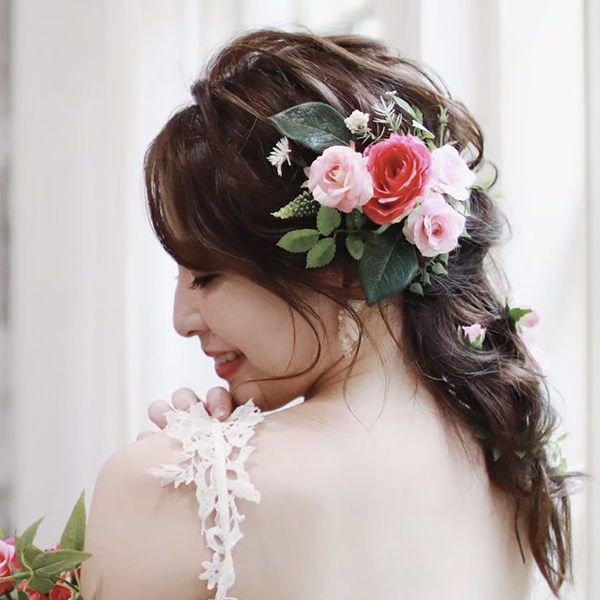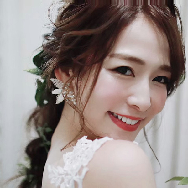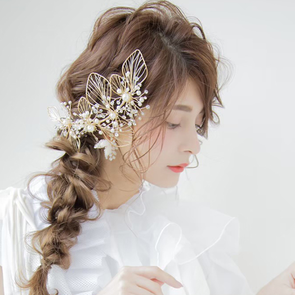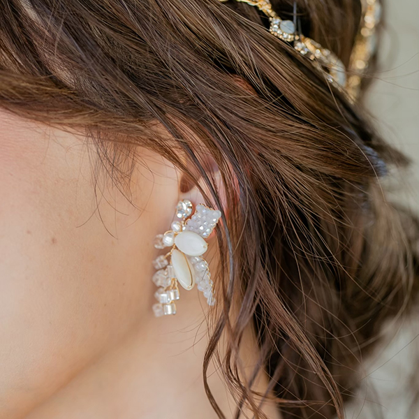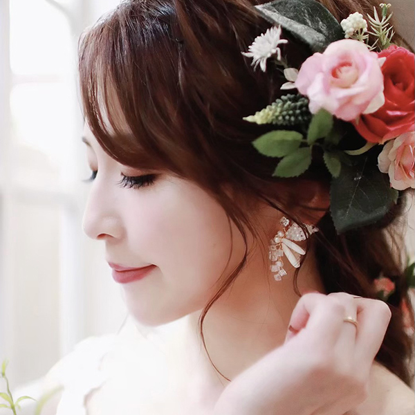 ディテールにこだわり、ビーズをひとつひとつ紡いでリーフにデザインしたイヤリング。ホワイトやクリスタルのビーズがナチュラルな印象の繊細なデザインです。小枝のヘッドアクセサリーとの相性もよくおすすめです。