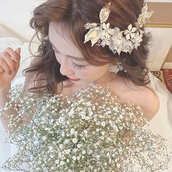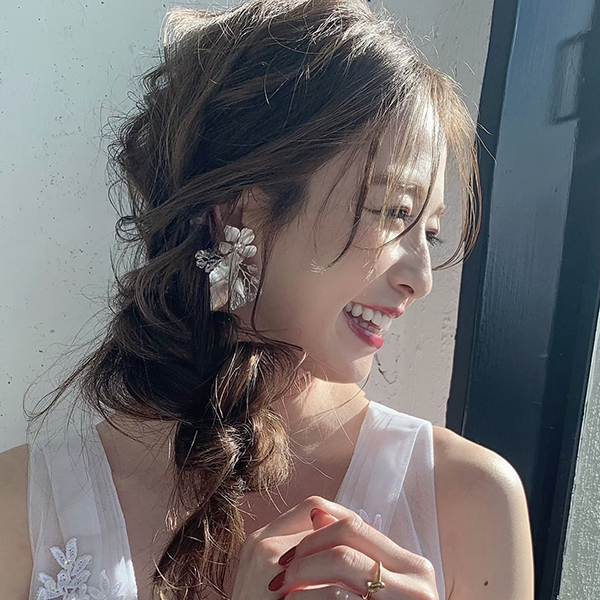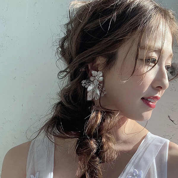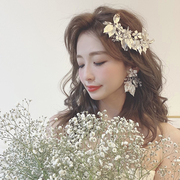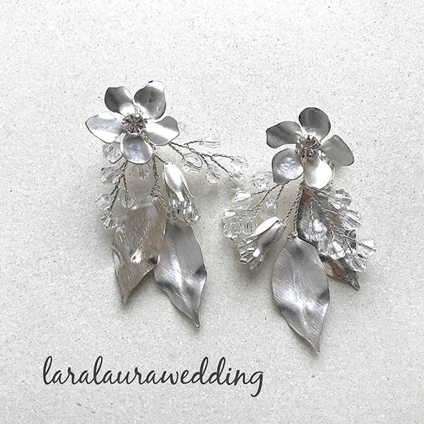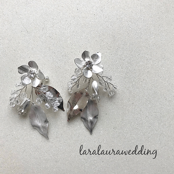 シルバーフラワー小枝のイヤリング。マット加工のフラワーにクリスタルのビーズ、ストーンを紡いだイヤリング。ディテールにこだわり、洗練されたデザインです。