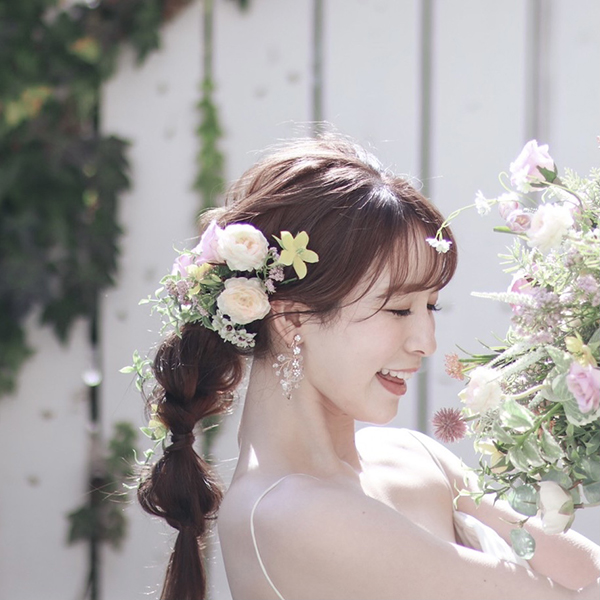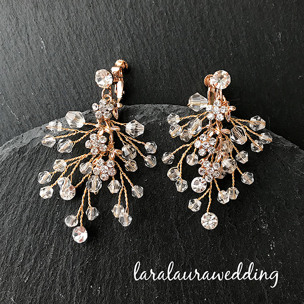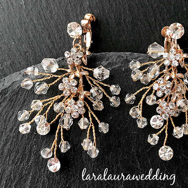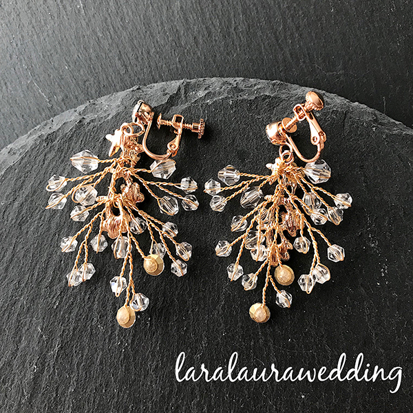 華奢なワイヤーにクリスタルビーズ、ストーンを紡いで作った小枝イヤリング。クリスタルのビーズがナチュラルな印象の繊細なデザインです。小枝のヘッドアクセサリーとの相性もよくおすすめです。