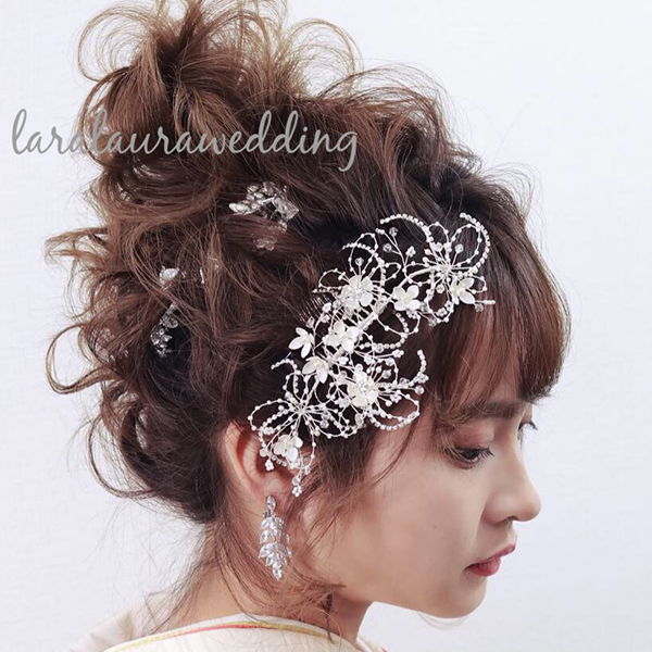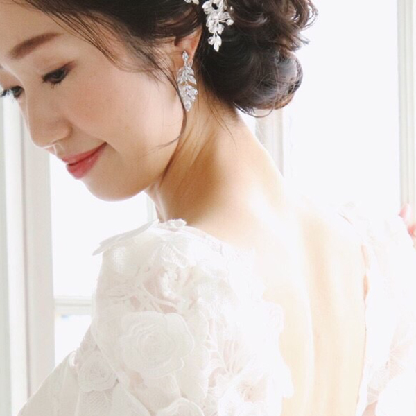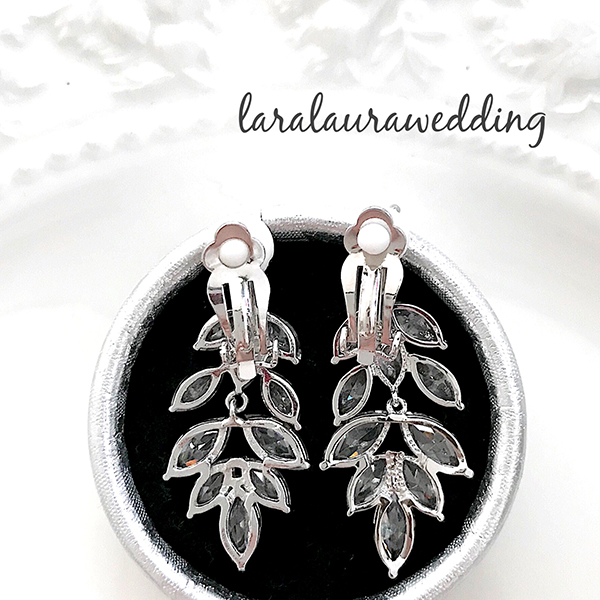リーフモチーフのジルコニアストーンイヤリング。人気のリーフモチーフ、程よいサイズ感で合わせやすいデザイン。遠くのゲストまで輝くジルコニアイヤリングで華やかな花嫁に…。