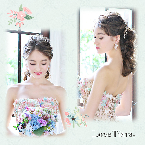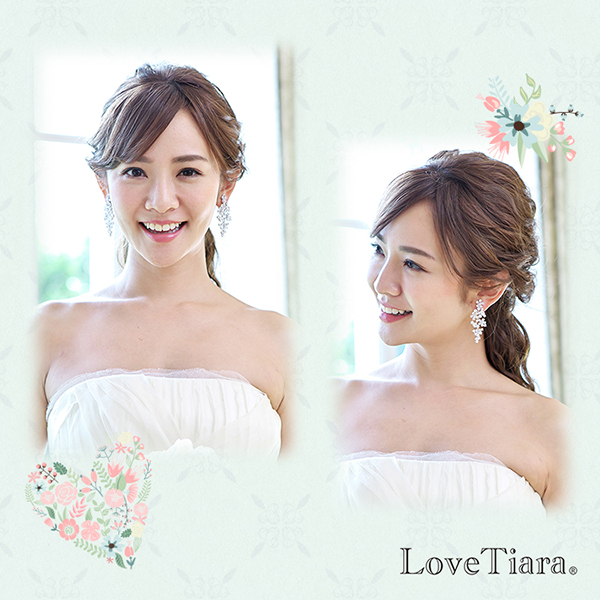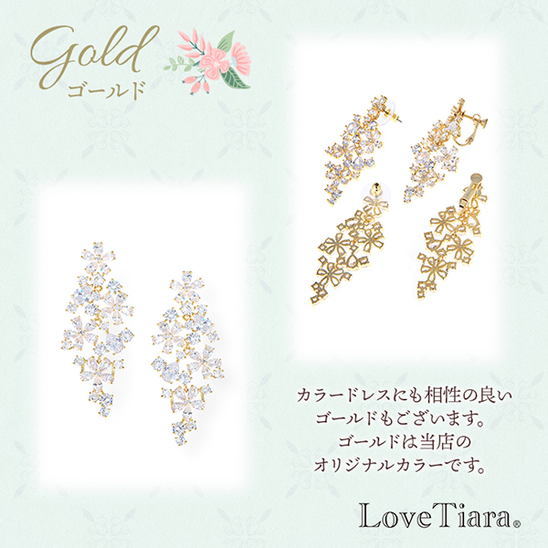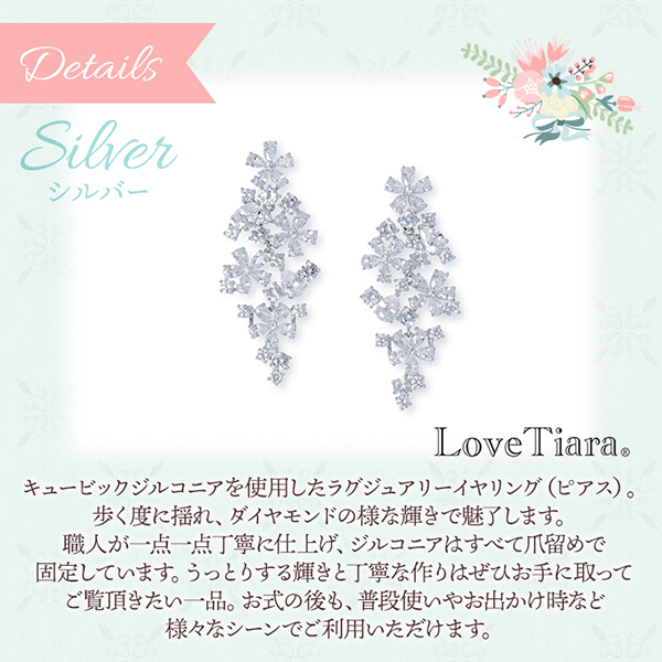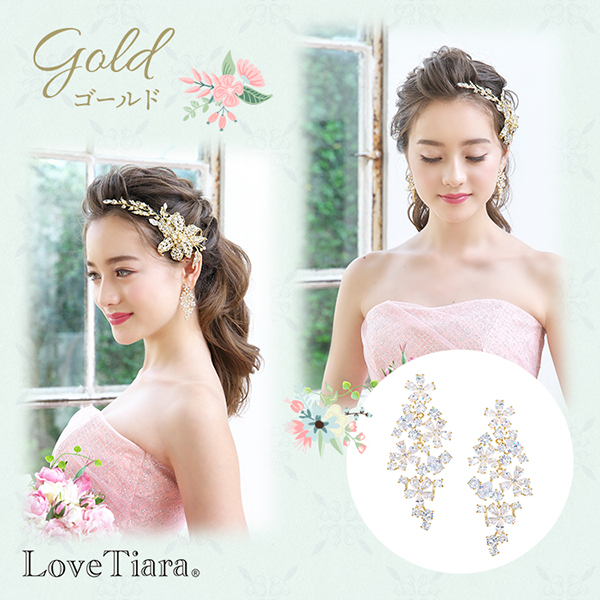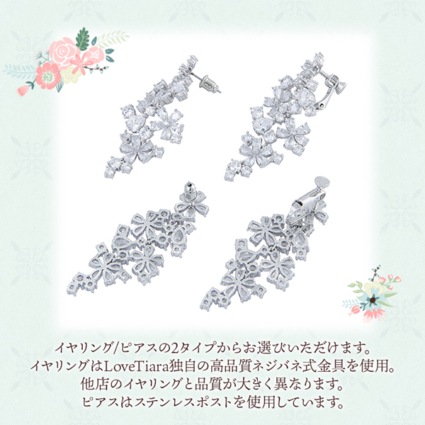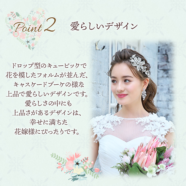 キュービックジルコニアを使用したボリューム感のあるサイズと揺れるデザインで、披露宴会場の遠くまで煌めきと存在感が伝わります。 ドロップ型のキュービックで花を模したフォルムが並んだ、キャスケードのような上品で愛らしいデザインです。 ウェディングドレスだけでなくカラードレスとも相性抜群!また、髪飾り有り・無しどちらでも合わせやすくスタイリングもしやすいです。