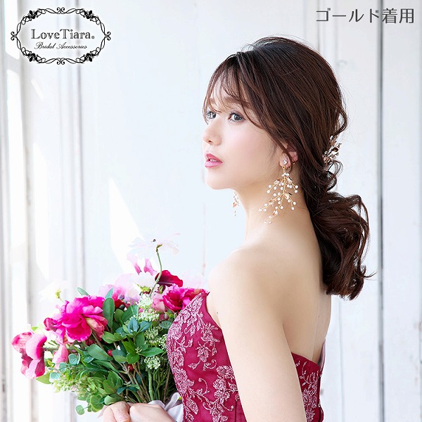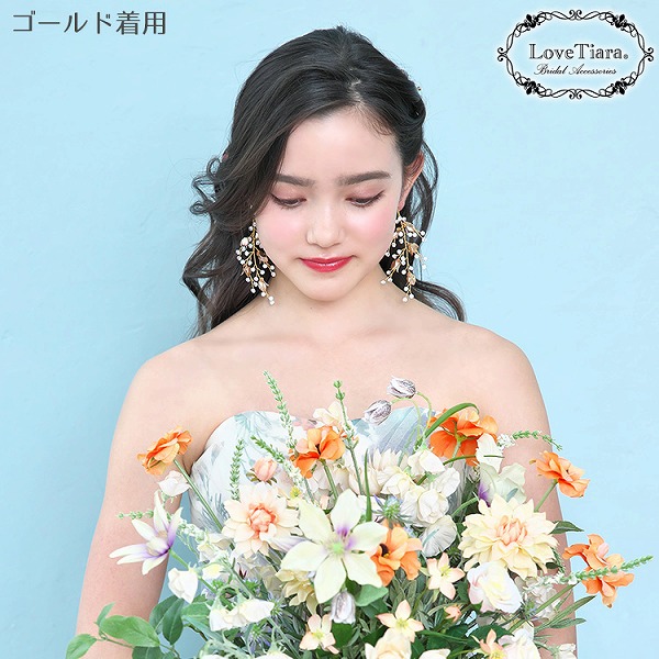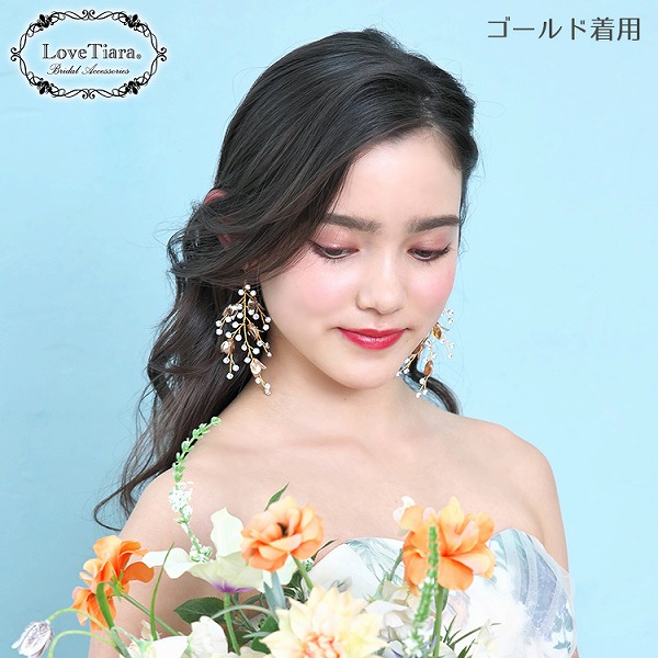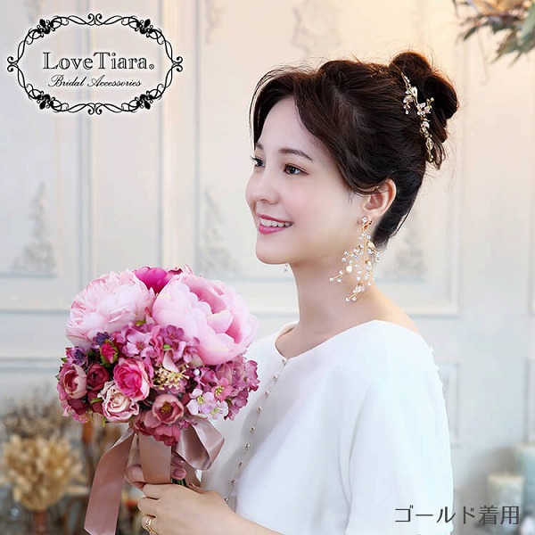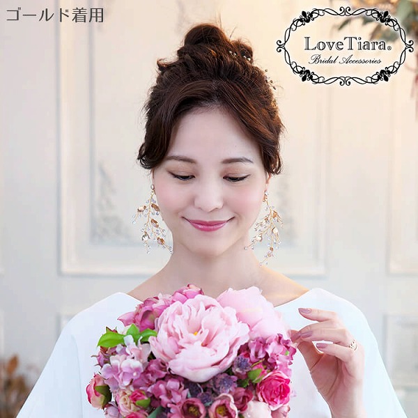 リーフとクリスタルを編み込んだ小枝アクセサリー。ナチュラルでシンプルなデザインで、着用するととても上品でお洒落なイメージに。シンプルな中にもしっかりボリューム感がございます。揺れるイヤリングで、お式や写真撮影はもちろん、お式後も普段使いでもご利用いただけます。ワイヤーワークで曲げられるので、横幅や長さは若干調節可能です。オリジナルポーチに入れてお送りいたします。