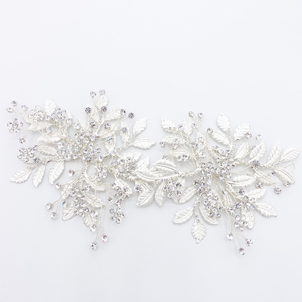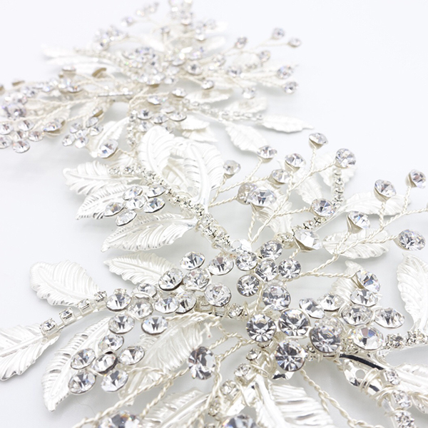 マット感のある上品なシルバーヘッドドレス。沢山のリーフと沢山のビジューがナチュラルに上品に輝くのが特徴。そのままボンネとして使用していただくと非常に可愛いらしさを表現します。サイズ感もインパクトもありますが、重くはありません。