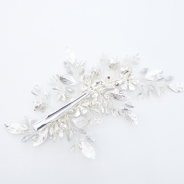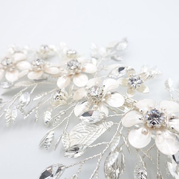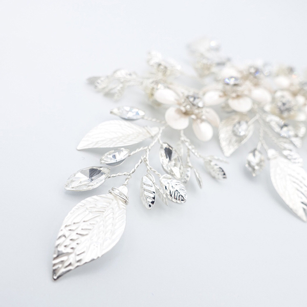 リーフとフラワーのモチーフのヘッドドレス。マットなシルバーのリーフとフラワーにラインストーンが散りばめられています。