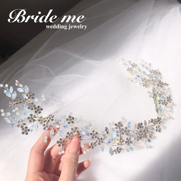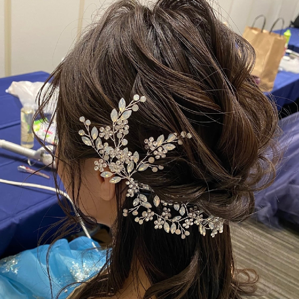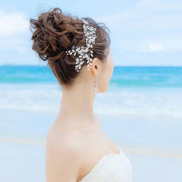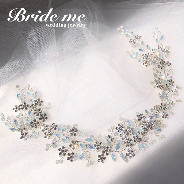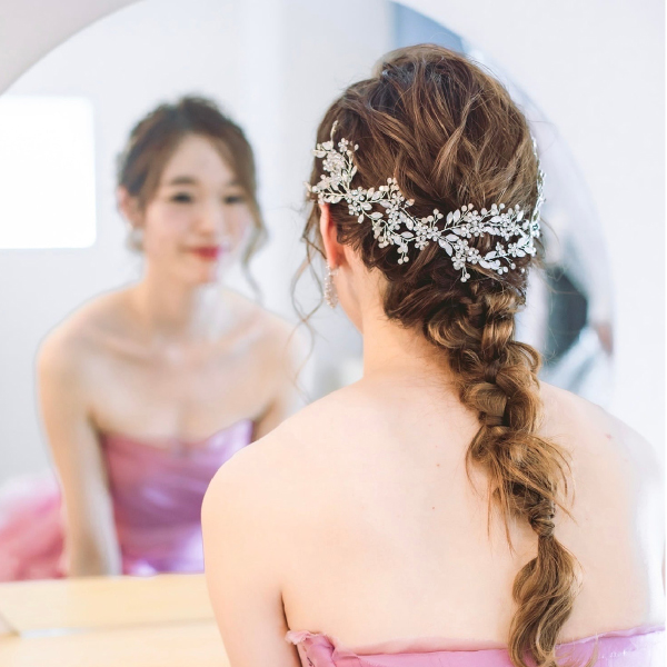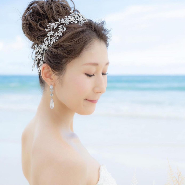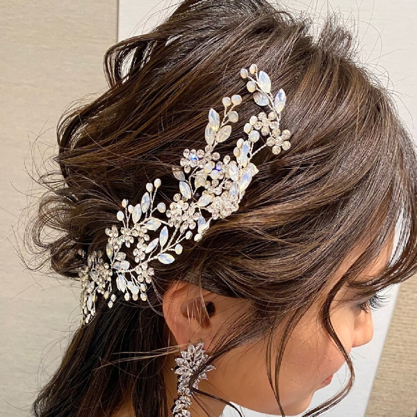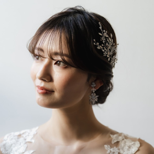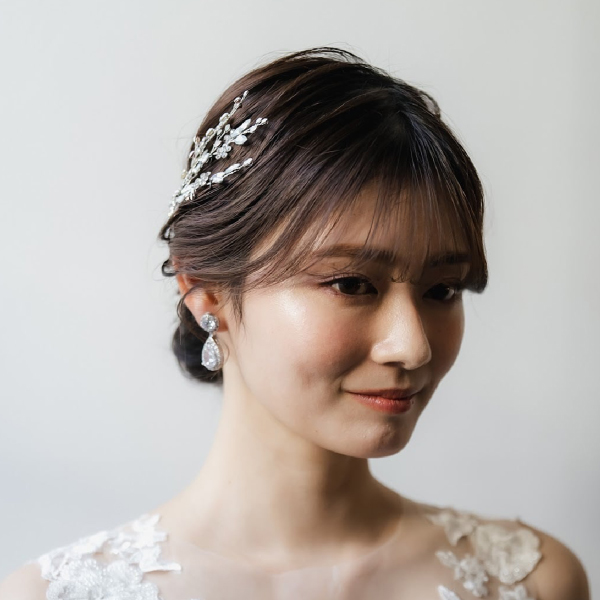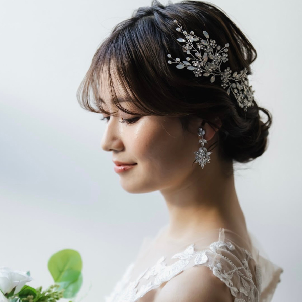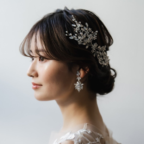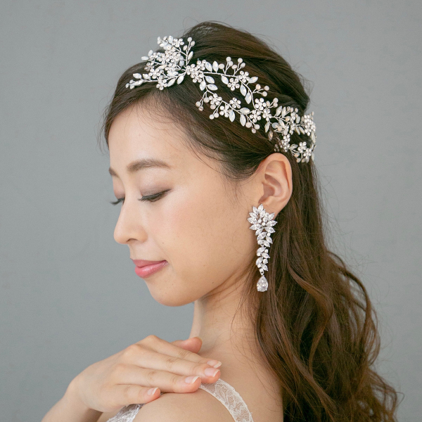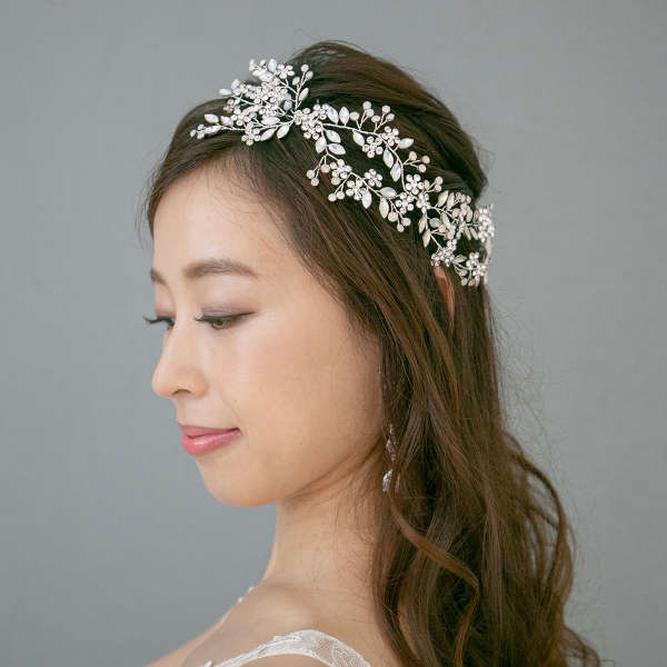 リーフと小花をモチーフにした、淡白カラーストーンを使用したヘッドアクセサリーです。ホワイト系のカラーストンは淡く優しい雰囲気で、ふんわりとした印象に仕上げてくれます。Aラインやプリンセスライン、エンパイアラインのドレスに合わせればよりナチュラルで可愛らしく、スレンダーラインやマーメイドラインなどの大人っぽいドレスに合わせれば、可愛さをプラスして大人可愛い雰囲気を演出してくれます。