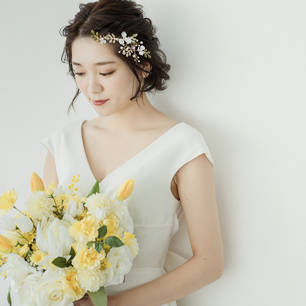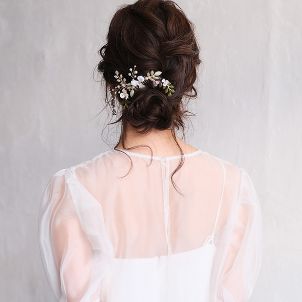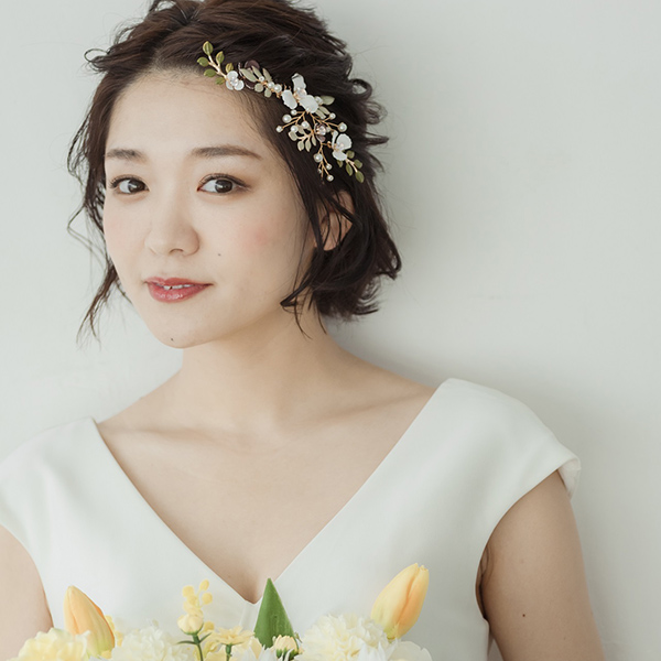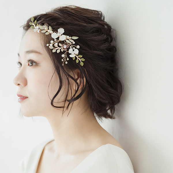 白い花と緑のリーフのナチュラルヘッドドレスで
