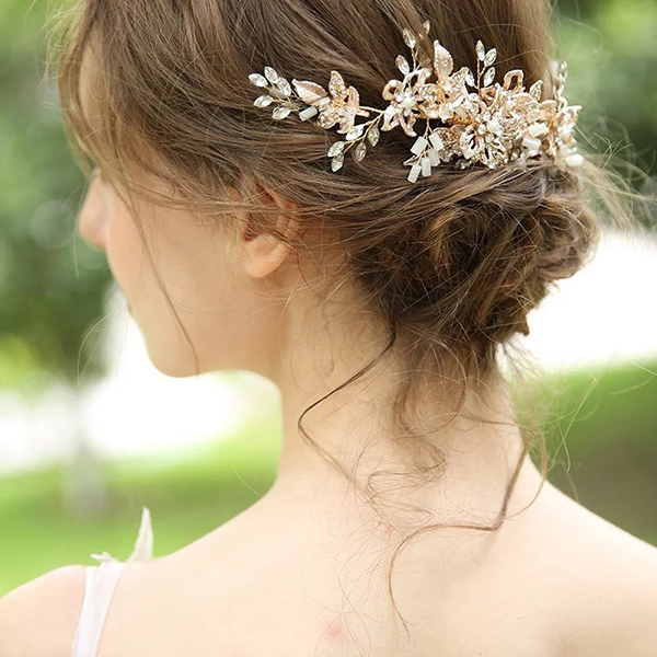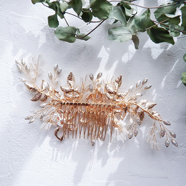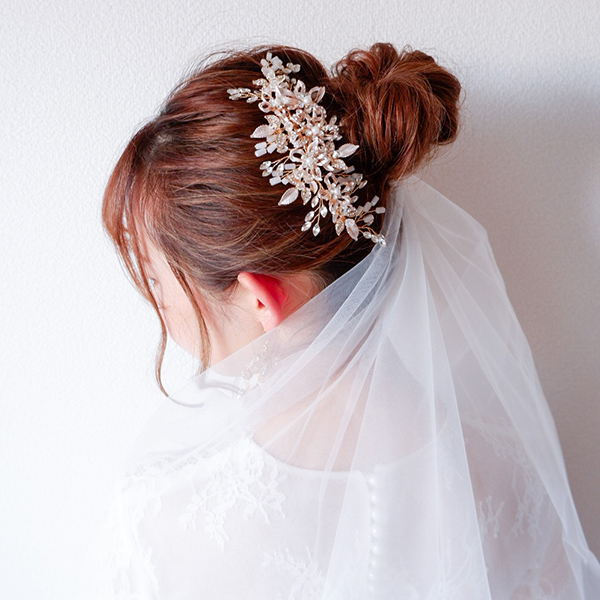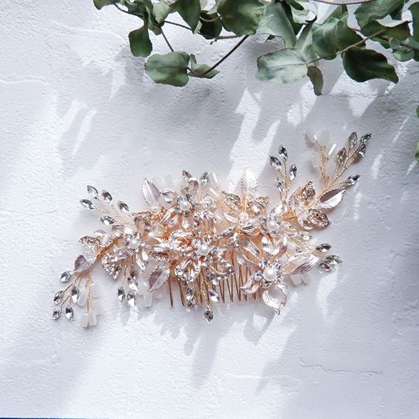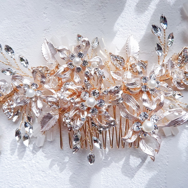 ピンクゴールドの色味に近い金属フラワーパーツが特徴なヘッドドレスで、