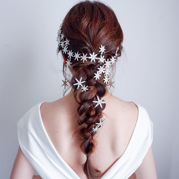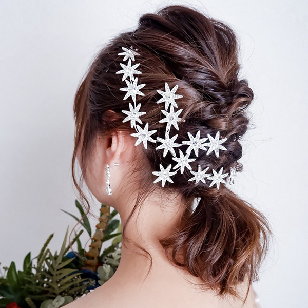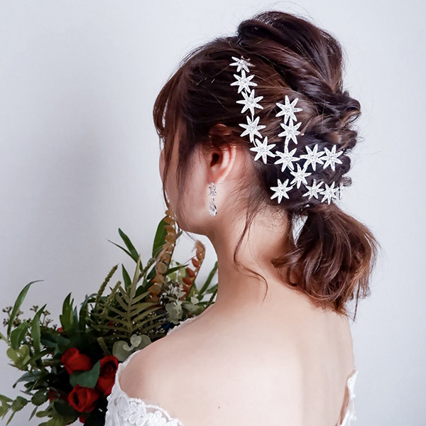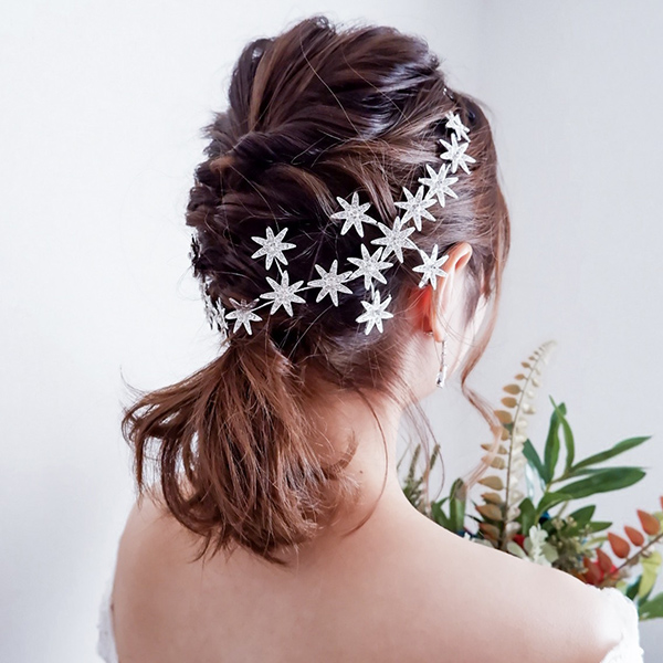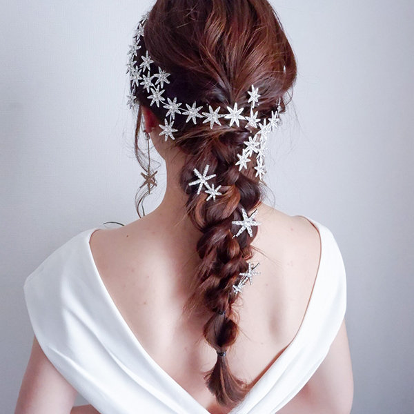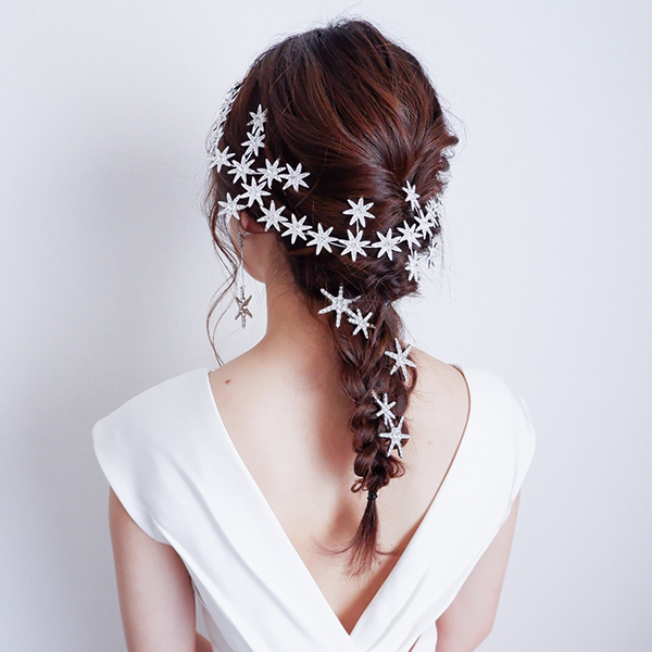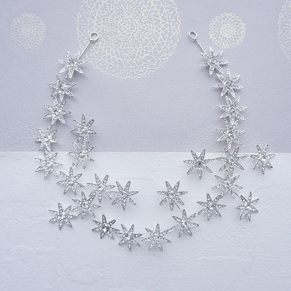 ビジュースターが連なったブライダルヘッドドレスで、カチューシャ風やバックカチューシャなど好きな位置で付けられます。
