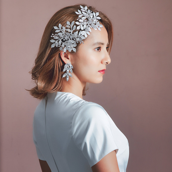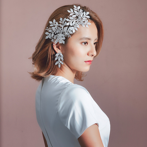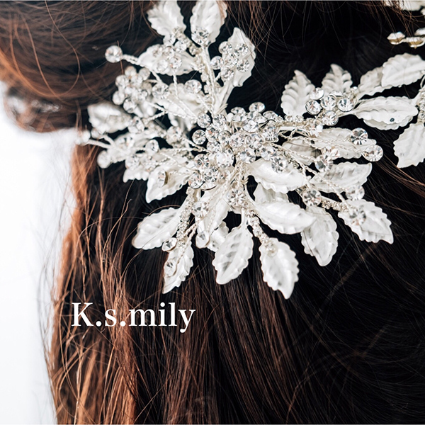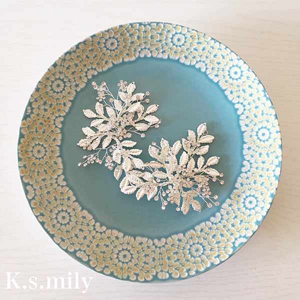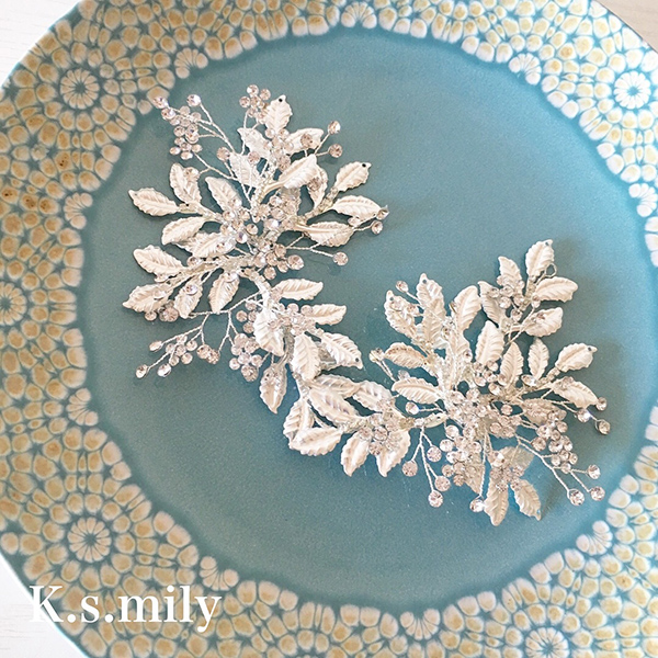 ビジュー、リーフモチーフパーツ使った可愛いヘッドドレスでピンで止めて固定できます。