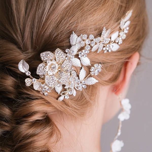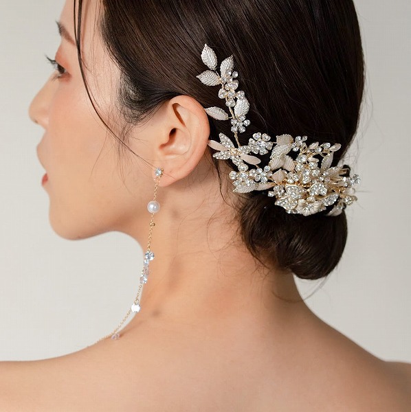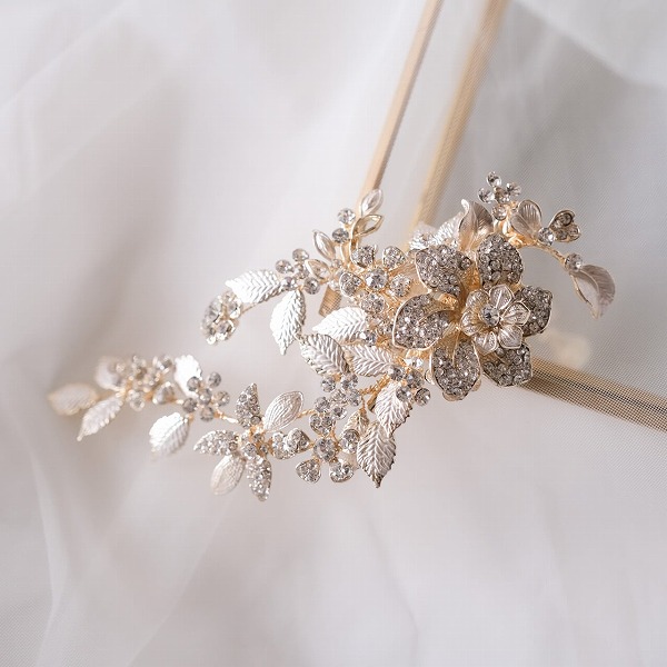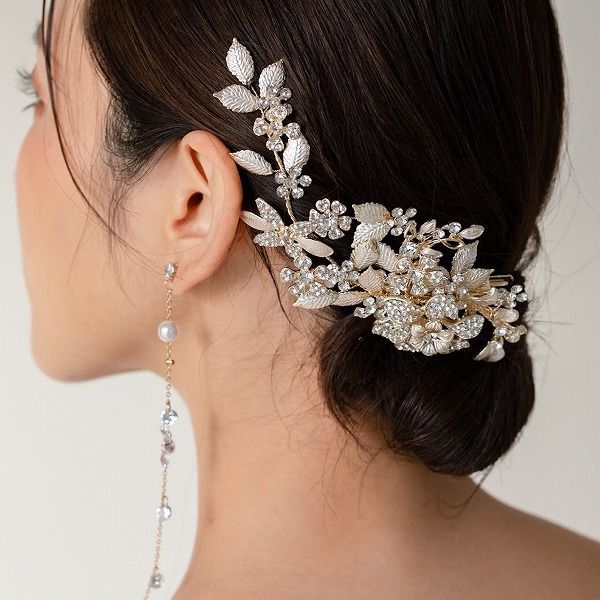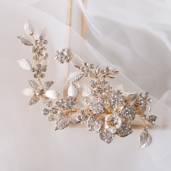 【送料無料】メール便 ブライダルヘッドドレス ビジュー フラワー リーフ ゴールド u25|ウェディング・ブライダルアクセサリーならPIARY(ピアリー)