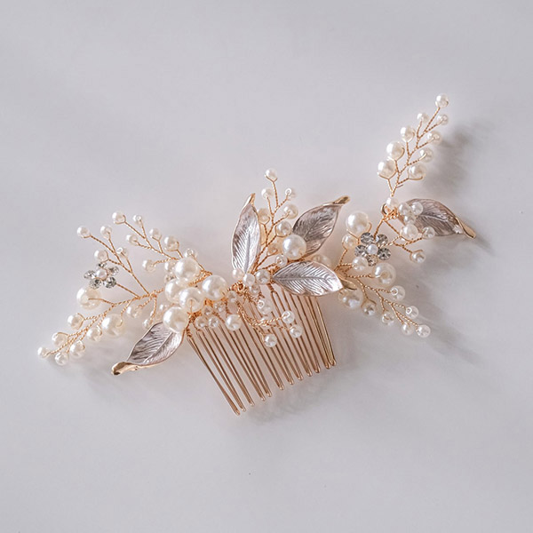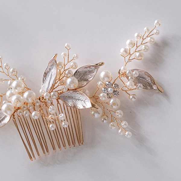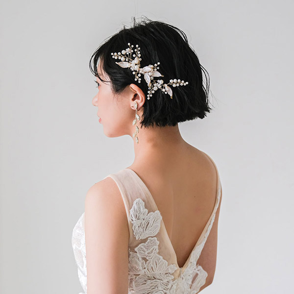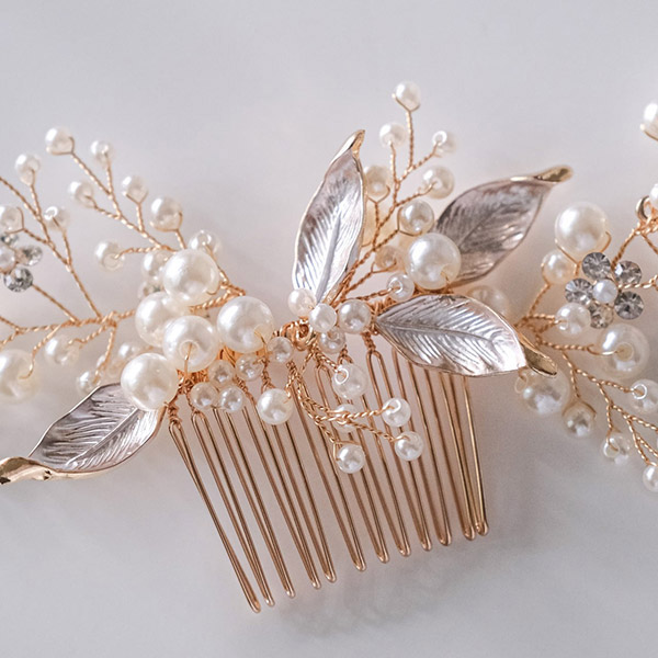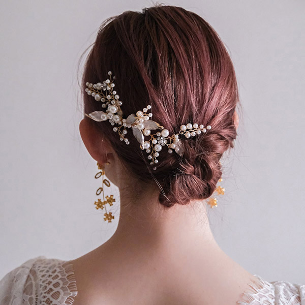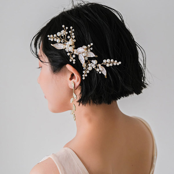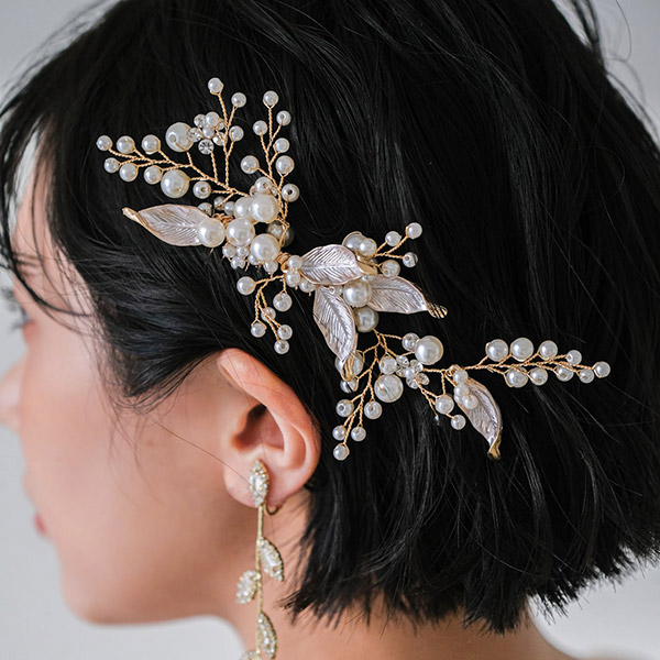 優雅な印象を与えるゴールドカラーのリーフモチーフと、上品で美しいパールがたくさんついたブライダルヘッドドレス。