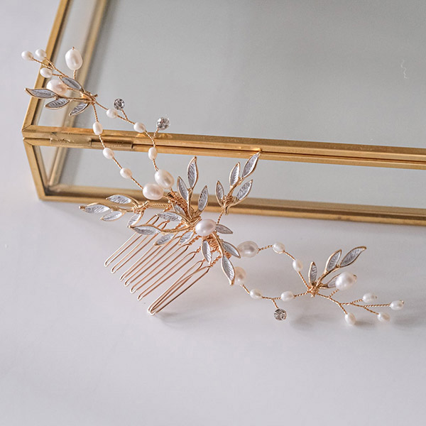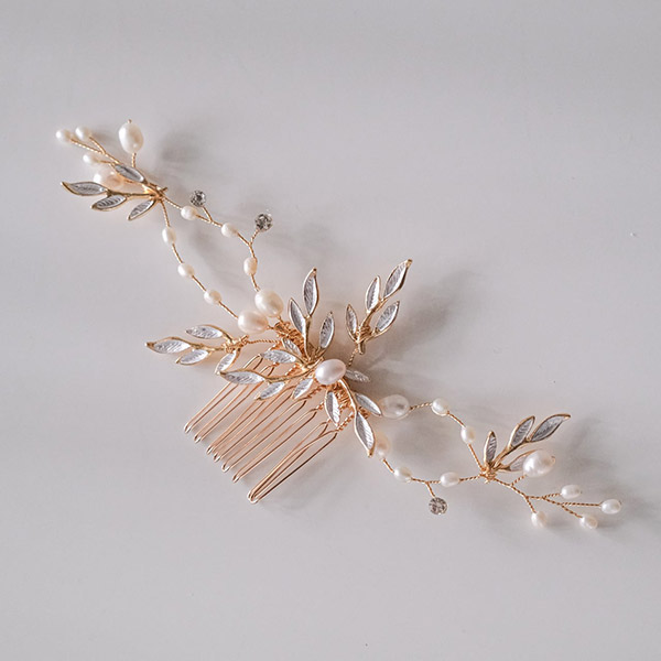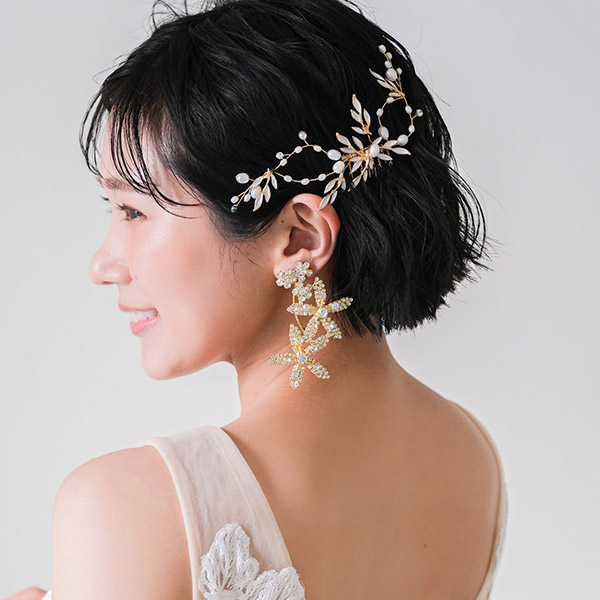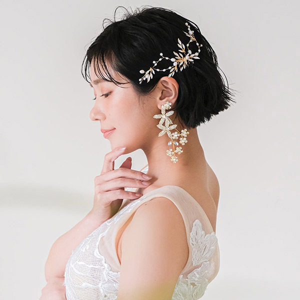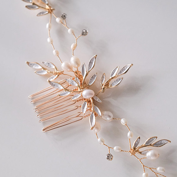 優雅な印象を与えるゴールドカラーの金属リーフモチーフと、上品で美しいパールがたくさんついたブライダルヘッドドレス。