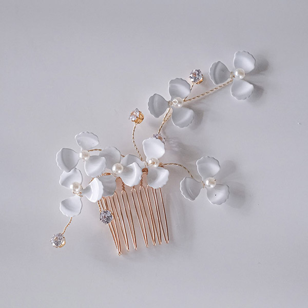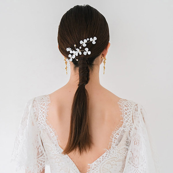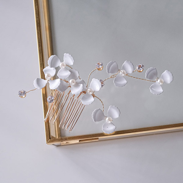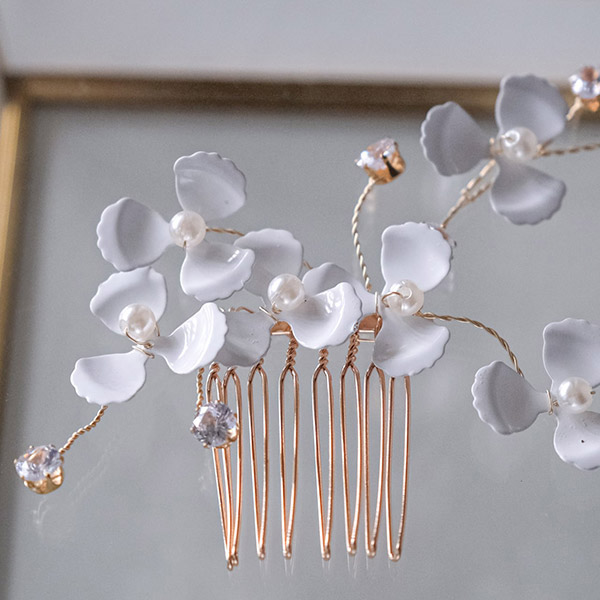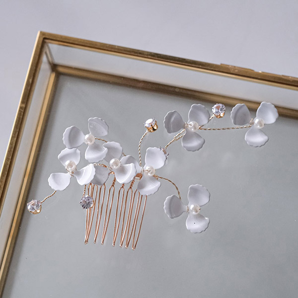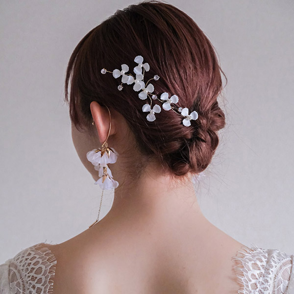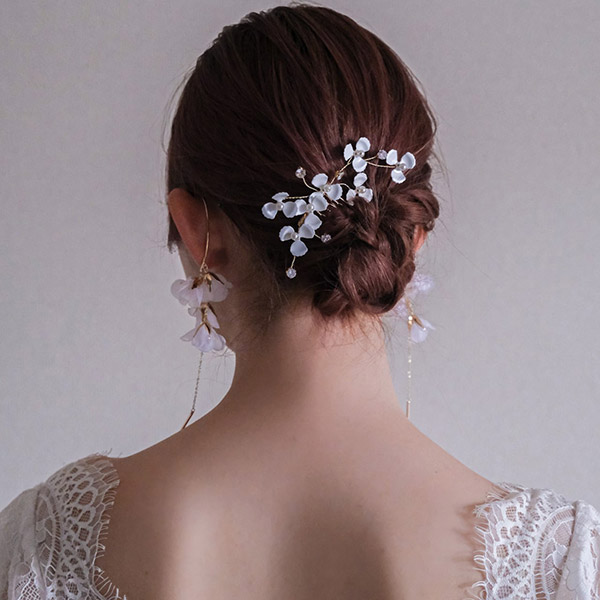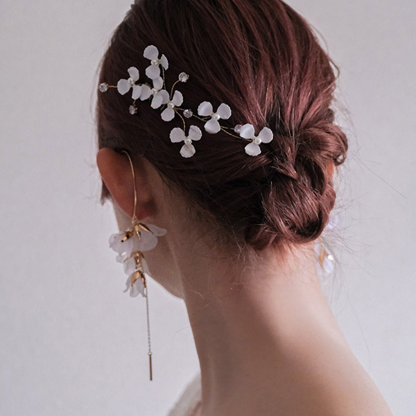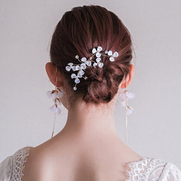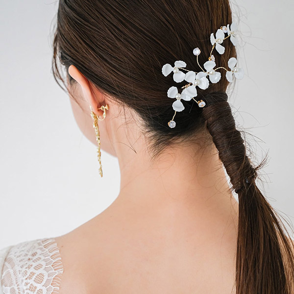 ヘアスタイルによって位置を変えてアレンジも自由自在。カラードレスにも合わせやすく、華やかな一日を演出してくれますよ。