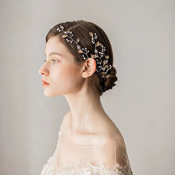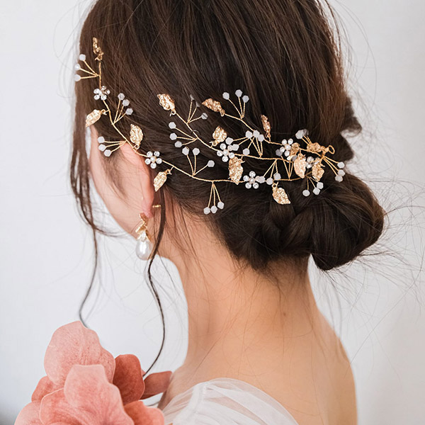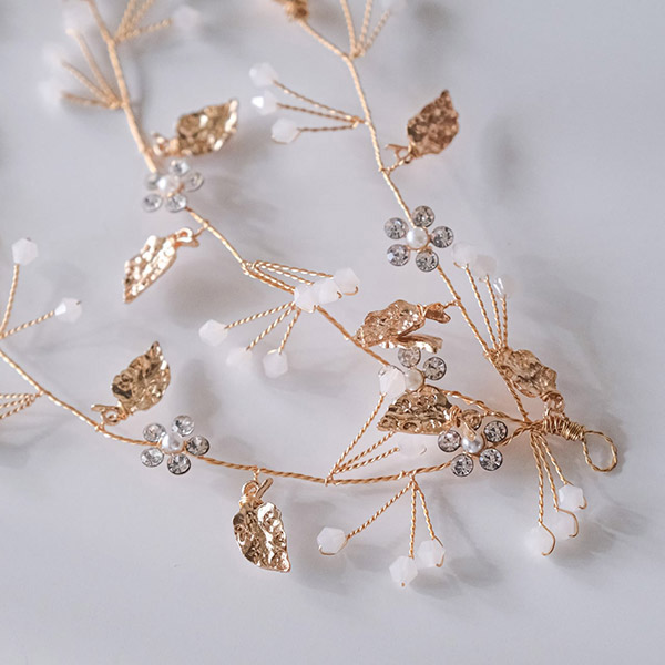 ビジューとゴールドの金属リーフを小枝のように組み合わせた、ゴージャスなデザインが印象的なヘッドドレスです!