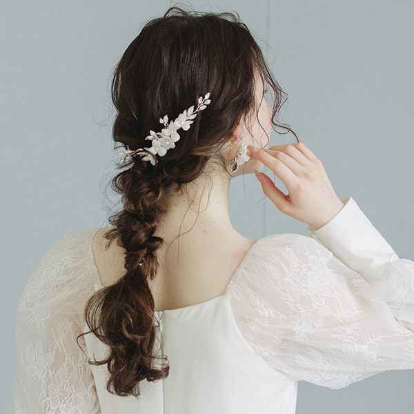 華やかなシルバーカラーが、透明感ある白のドレスに優しく映え、和装にも合うデザインです。