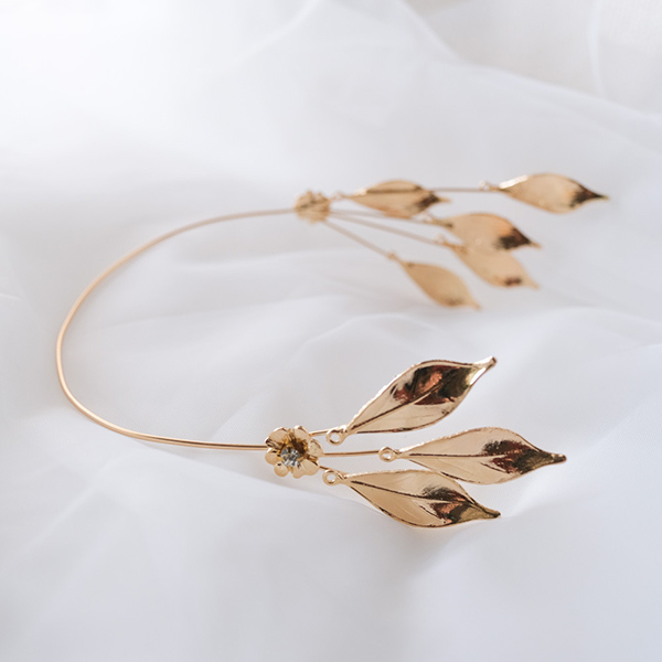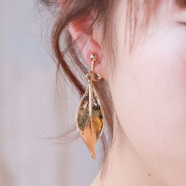 ゴールドリーフのイヤリング付きで左右非対称のおしゃれなデザインをしています。