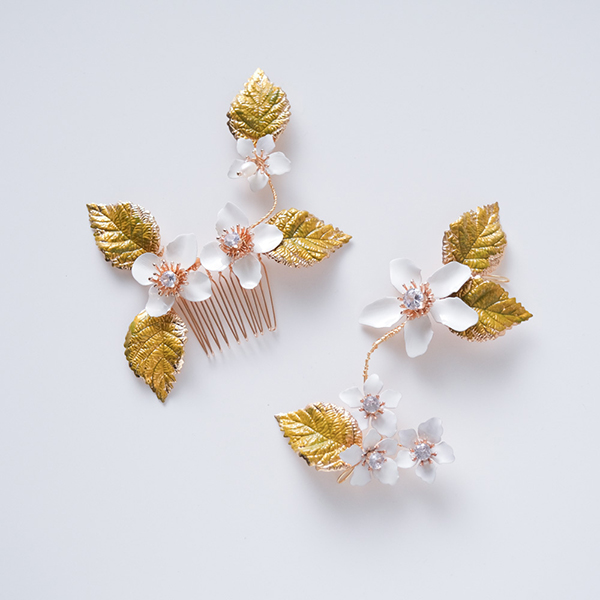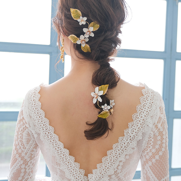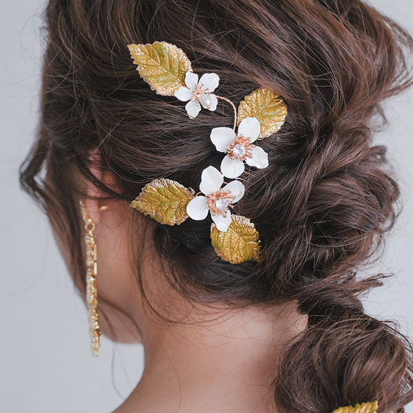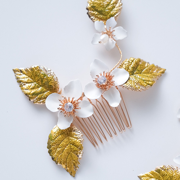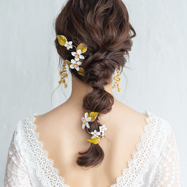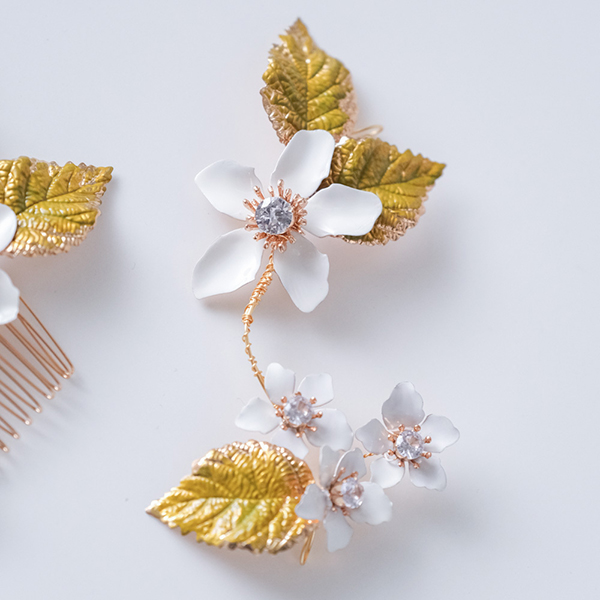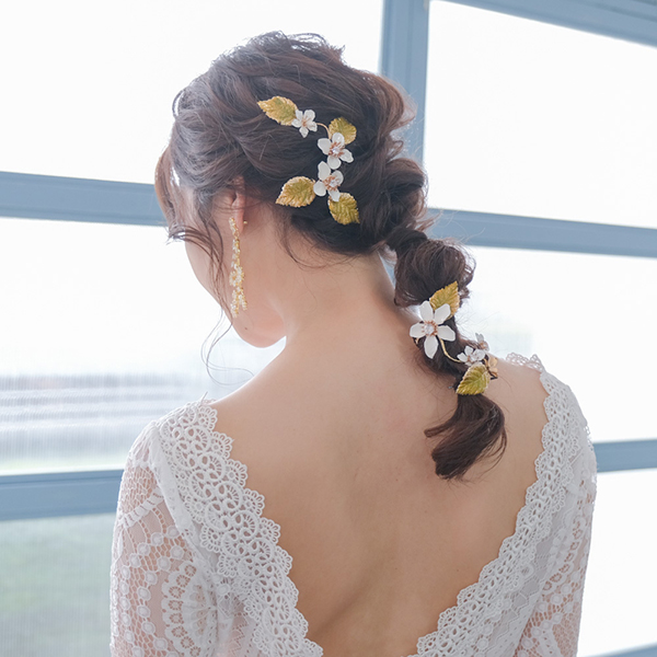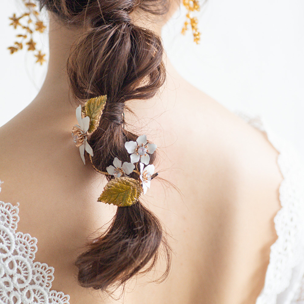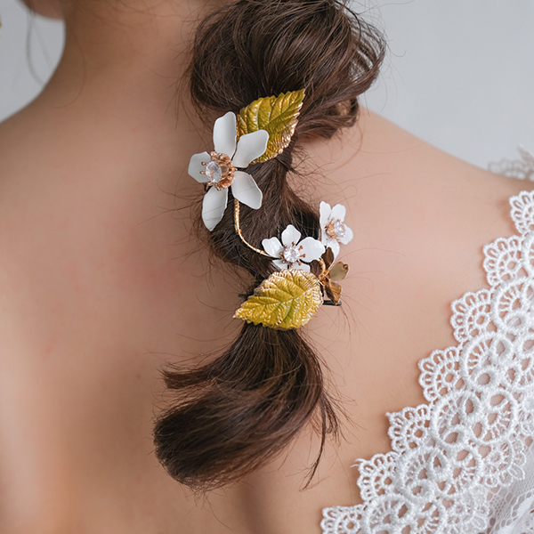 白い花と緑の葉がついたナチュラルヘッドドレス。