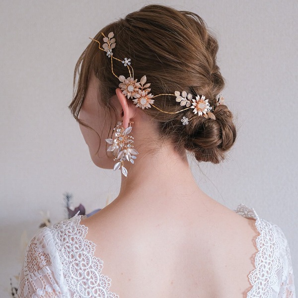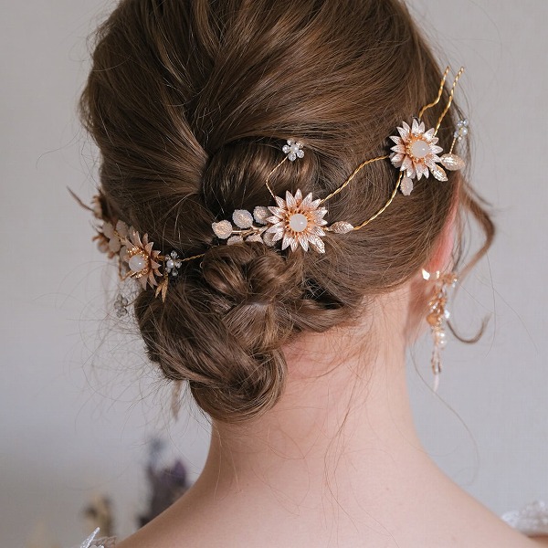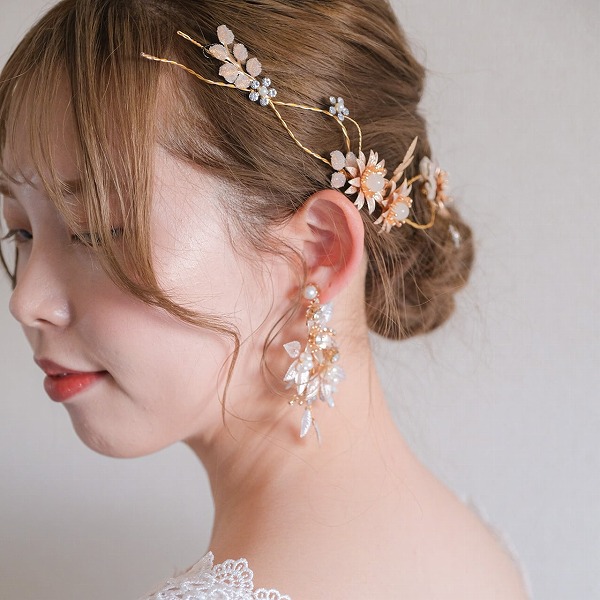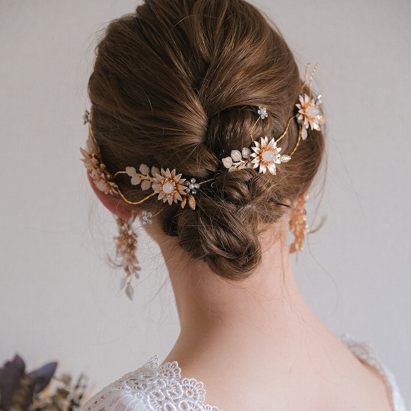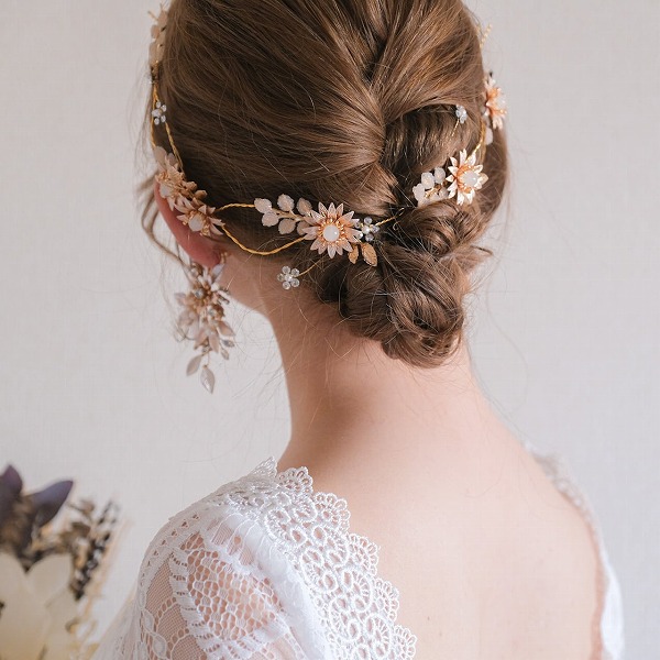 サンフラワーのようなお花のデザインのヘッドドレス。様々なヘアスタイルにぴったりです。ヘッドドレスの先に丸い輪があり、ピンで留められます。ワイヤーは柔らかいので伸ばしたり曲げたりできます。これでウェディングが華やかになりますよ♪
