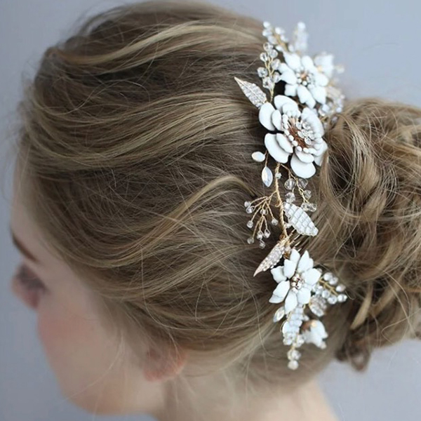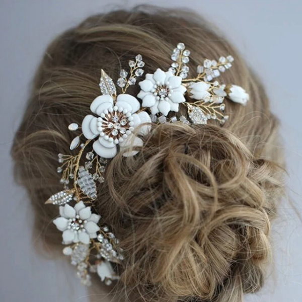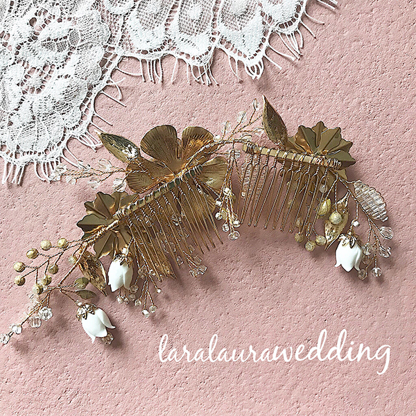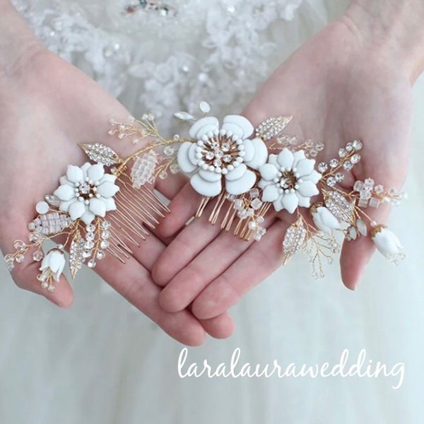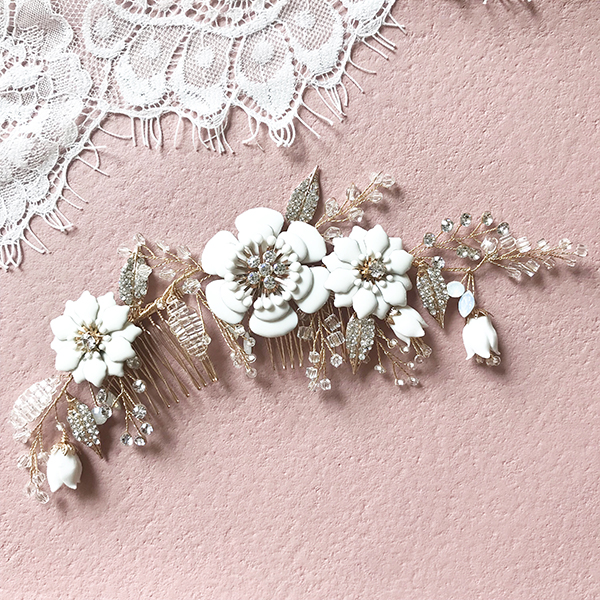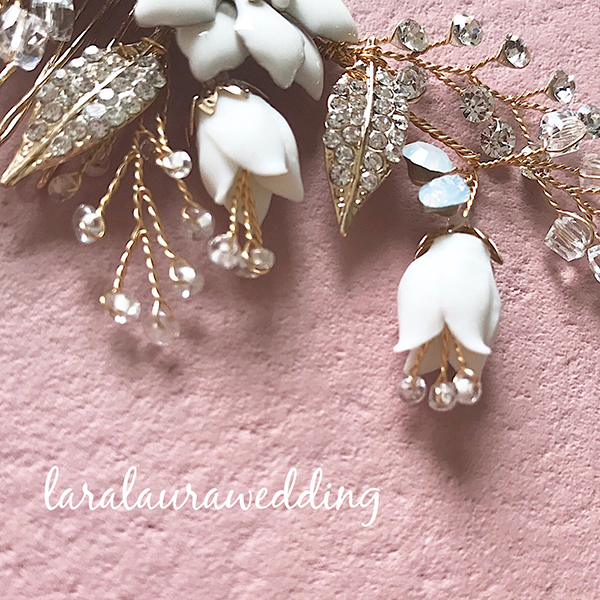 ホワイトフラワーのヘッドドレス。華やかなホワイトのフラワーに、クリスタルストーンやビーズを細かく紡いだヘッドドレス。蕾のおはななどひとつひとつディテールにこだわったヘッドドレスになります。上品ながら華やかさのあるヘッドドレスでトレンドの花嫁に…。