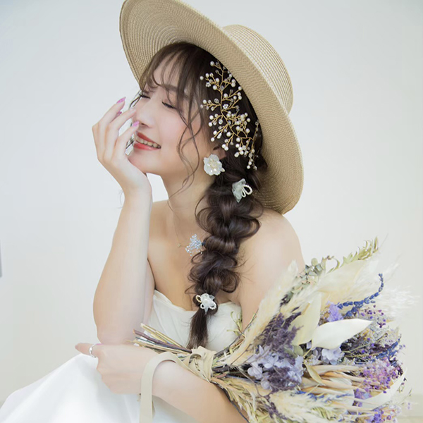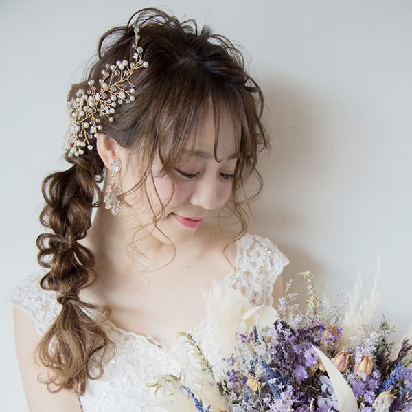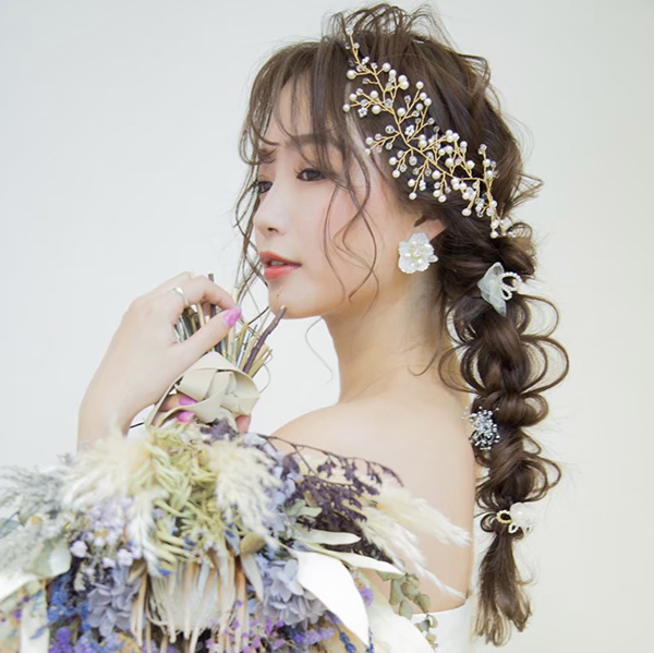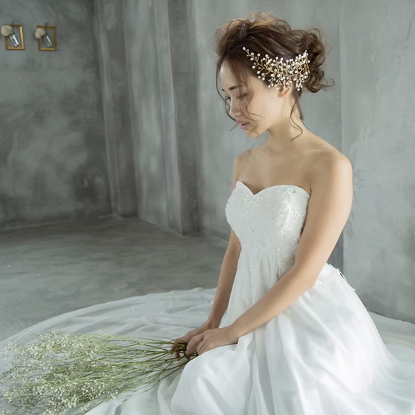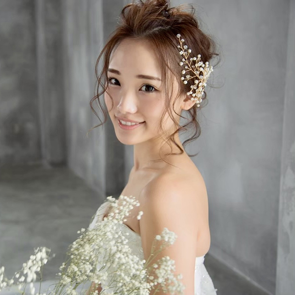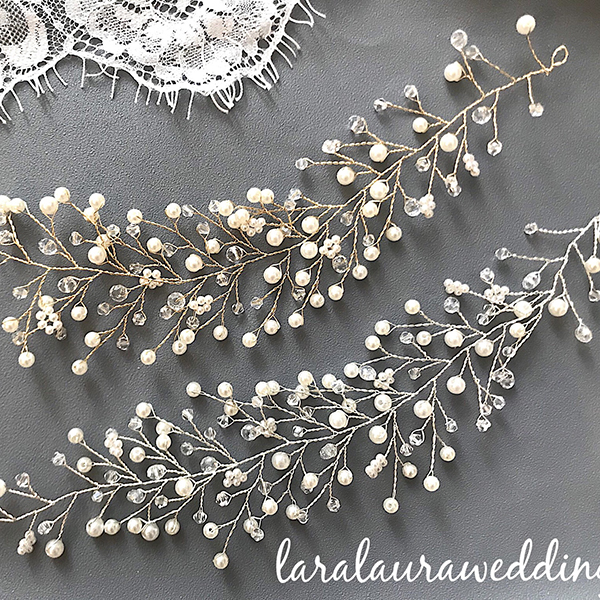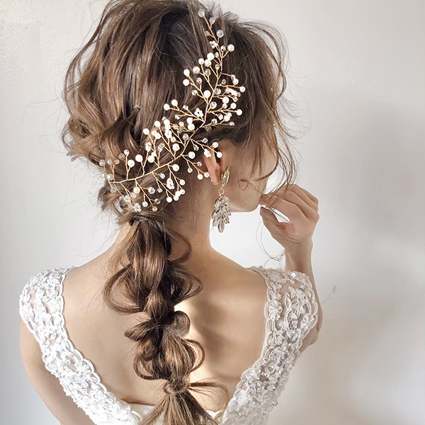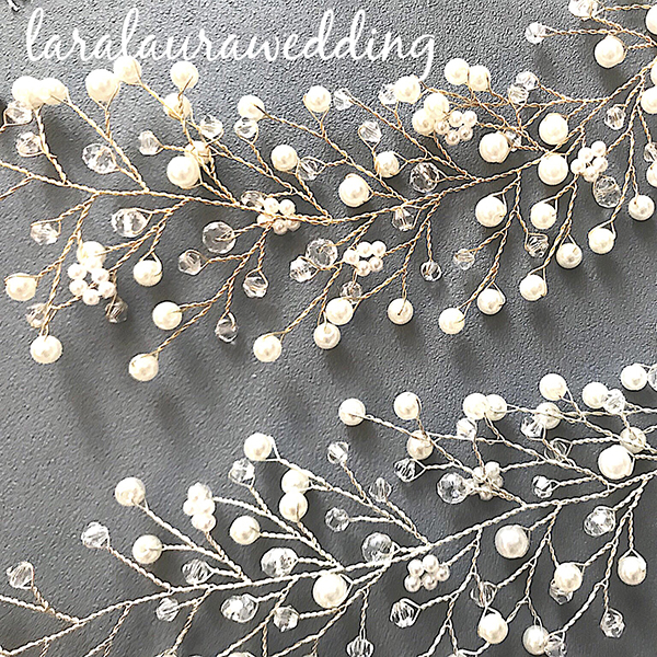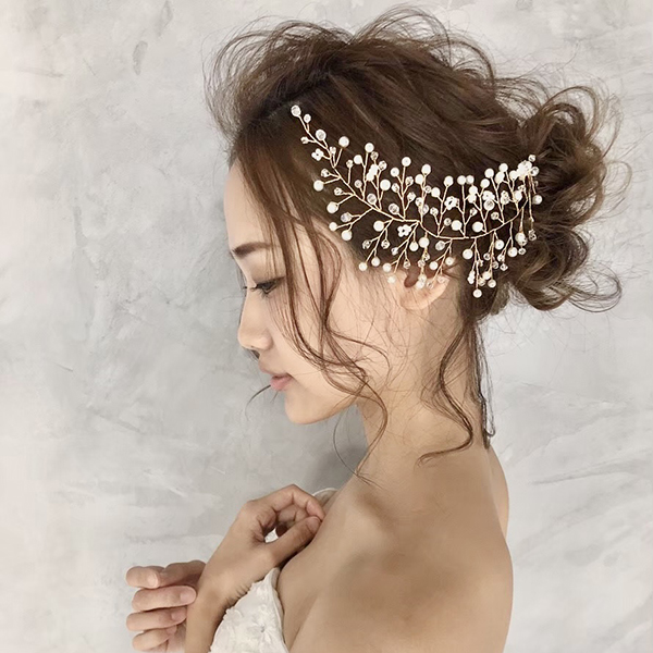 小枝のアクセサリー。トレンドの小枝のアクセサリーをよりシンプルにナチュラルに。サイドに付けていただくデザインとなります。一つひとつ丁寧に紡いだパールとクリアビーズが、繊細でナチュラルな花嫁に…。カラーはゴールドとシルバーからお選び頂けます。