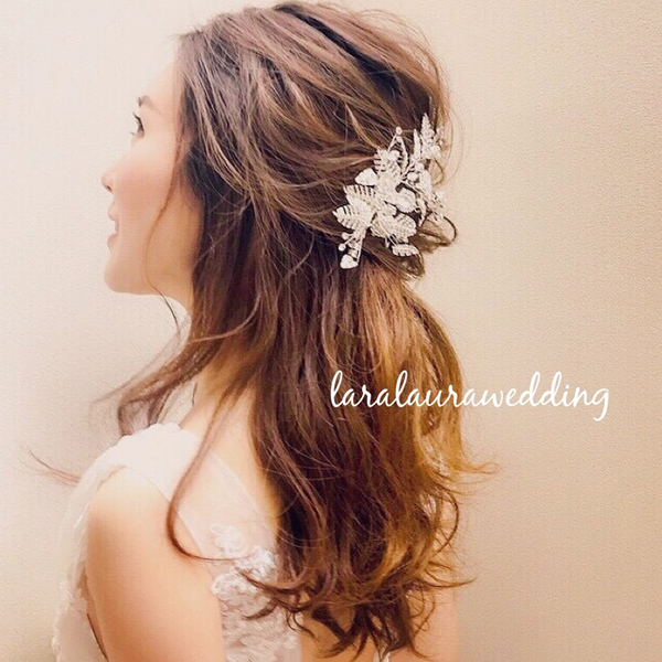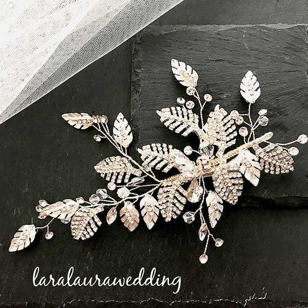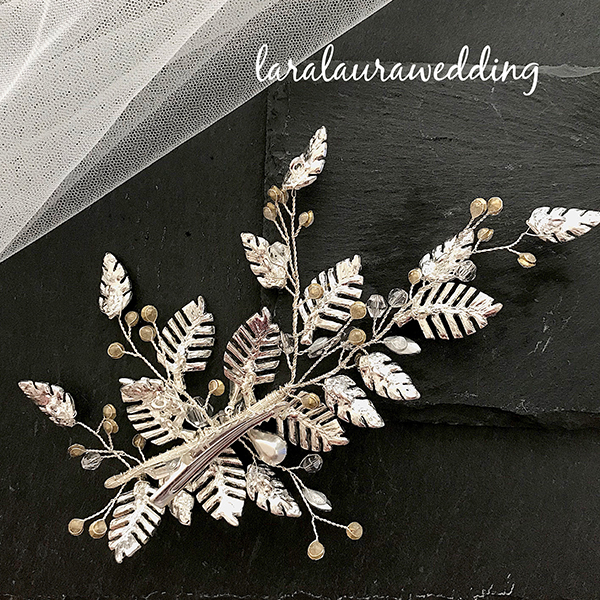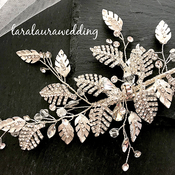 ストーンリーフのヘッドアクセサリー。リーフひとつひとつにディテールにこだわったヘッドドレス。シンプルで上品なデザインはドレスを選ばすお召しいただけます。おおぶりのピアスやイヤリングとの相性もいいです。