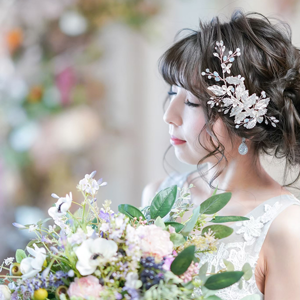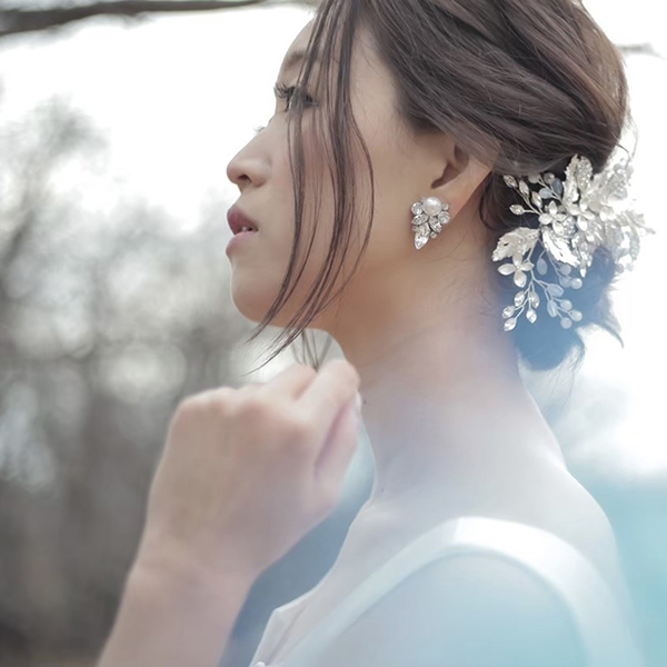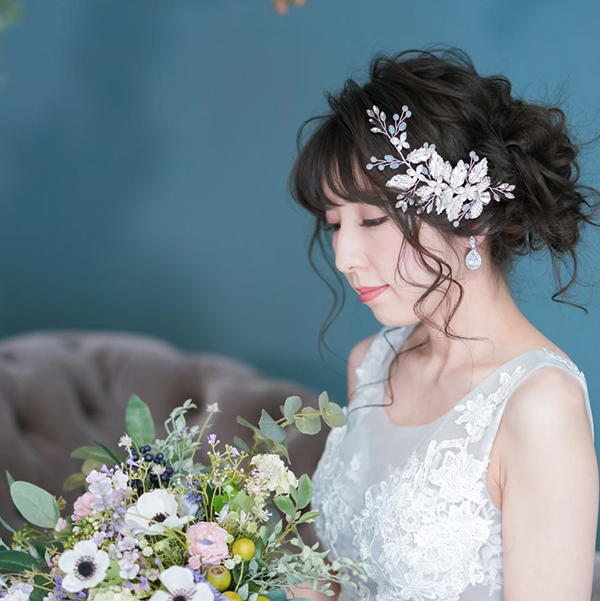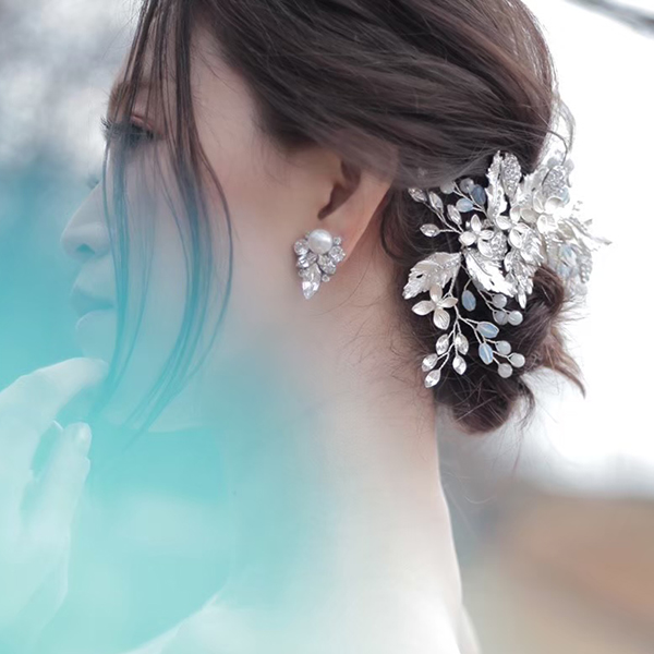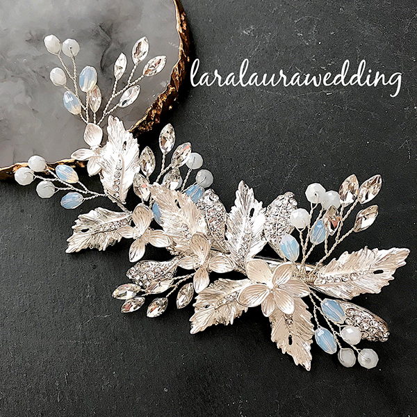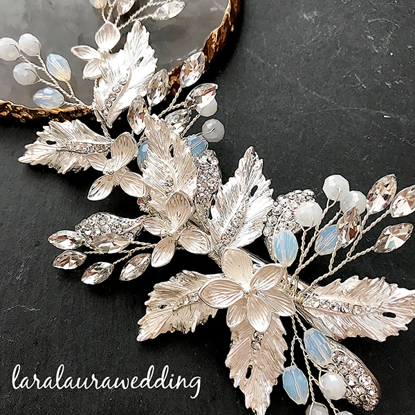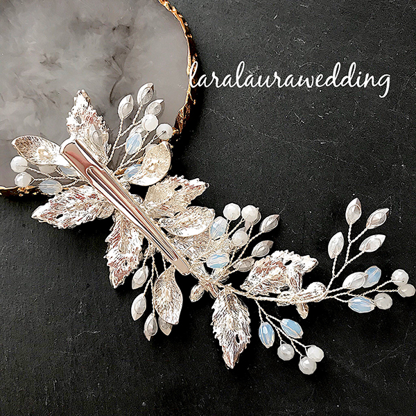 ホワイトオパールとリーフフラワーのヘッドドレス。マット加工のリーフを中心にストーン、オパールを紡いだヘッドドレス。シンプルで上品なデザインはドレスを選ばすお召しいただけます。程よいサイズ感はおおぶりのピアスやイヤリングとの相性もいいです。