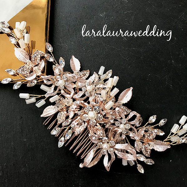 ピンクゴールドフラワーのヘッドドレス。ピンクゴールドにマット加工された、立体感のあるフラワーモチーフがポイント。白っぽい加工なので優しい雰囲気でお召しいただけます。クリスタルストーンやパールもバランスよく紡いでありますのでキラキラと光る華やかさも!ワイヤーで出来ておりますので、ある程度形が変えやすくお好みのヘアアレンジと合わせていただけます。 ウェディングドレス、カラードレス、和装との相性も抜群!