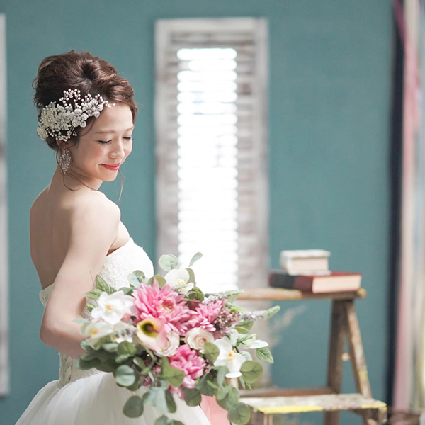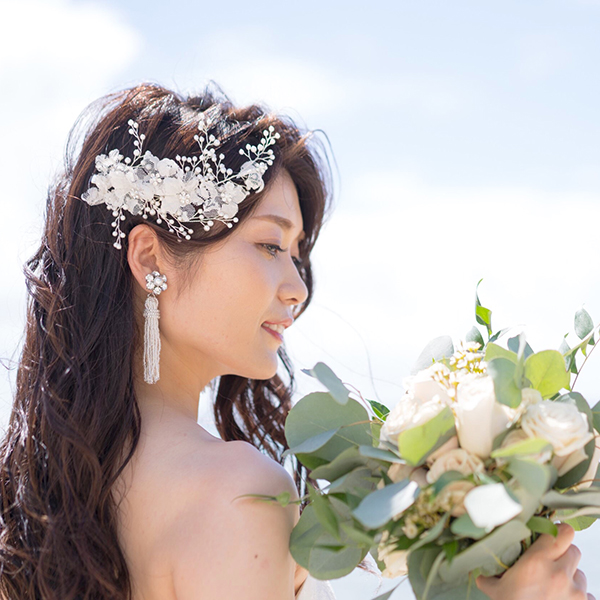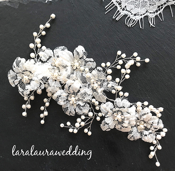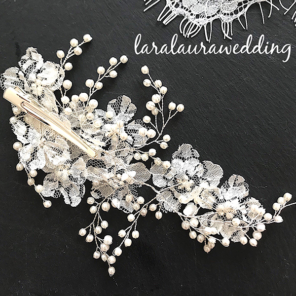 レースフラワーのヘッドドレス。上品なアイボリーのレースをフラワーモチーフにカッティングし、クリスタルストーンとパールで仕上げたヘッドドレス。バランスよく紡いだパールの小枝でトレンドを抑えたヘッドドレスになっています。ウェディングドレスはもちろん、和装にも合わせていただけます。※留め具はクリップタイプとなります。