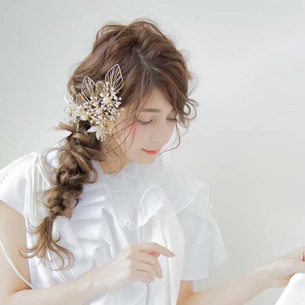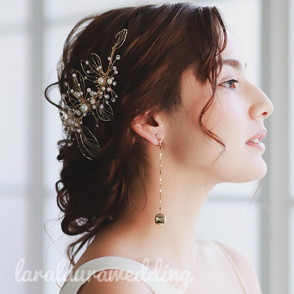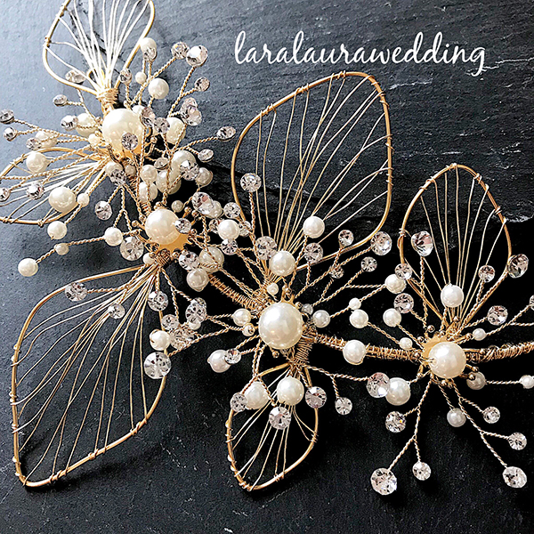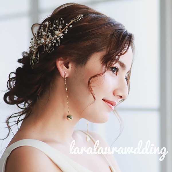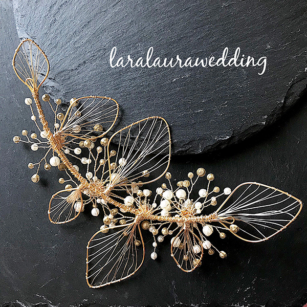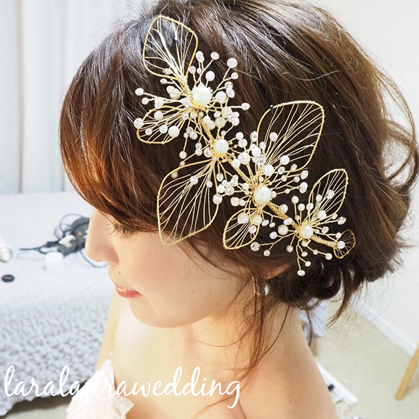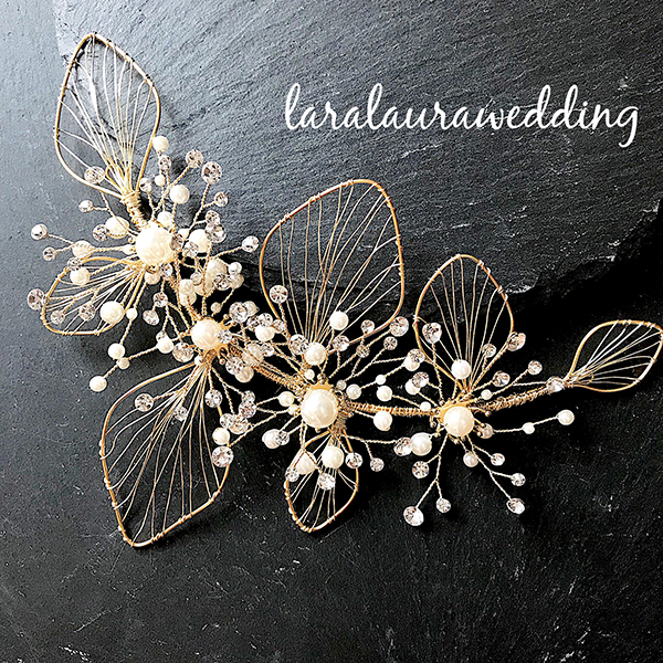ゴールドワイヤーのヘッドドレス。ゴールドフラワーをリーフの模様に丁寧にハンドメイド。パールとクリスタルのストーンで上品で女性らしい印象でお召しいただけます。ワイヤーで出来ておりますので、ある程度形が変えやすくお好みのヘアアレンジと合わせていただけます。ウェディングドレスはとちろん和装との相性も良いです。