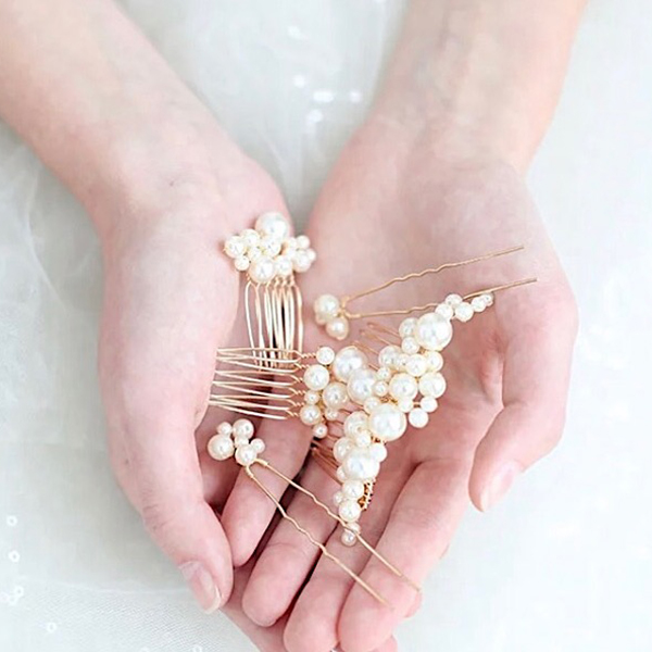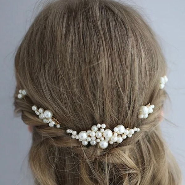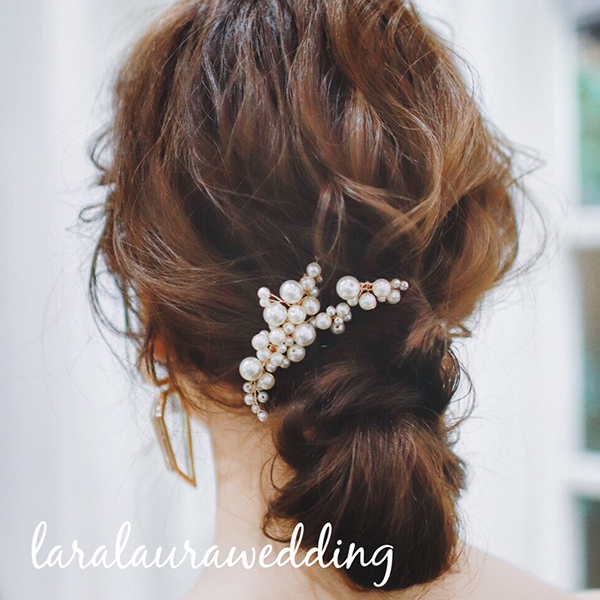 パールのヘッドパーツ5点セット。ハーフアップ、網下ろし、シニヨンスタイルなどお好みに合わせてお召しただけます。ウェディングドレスにはもちろん、パーティなどお呼ばれのドレスにも相性も良いです。
