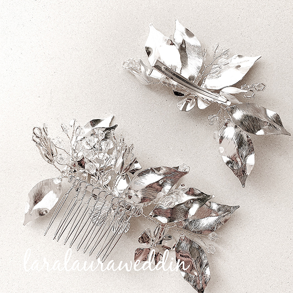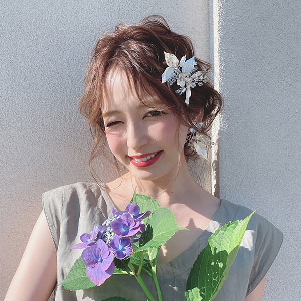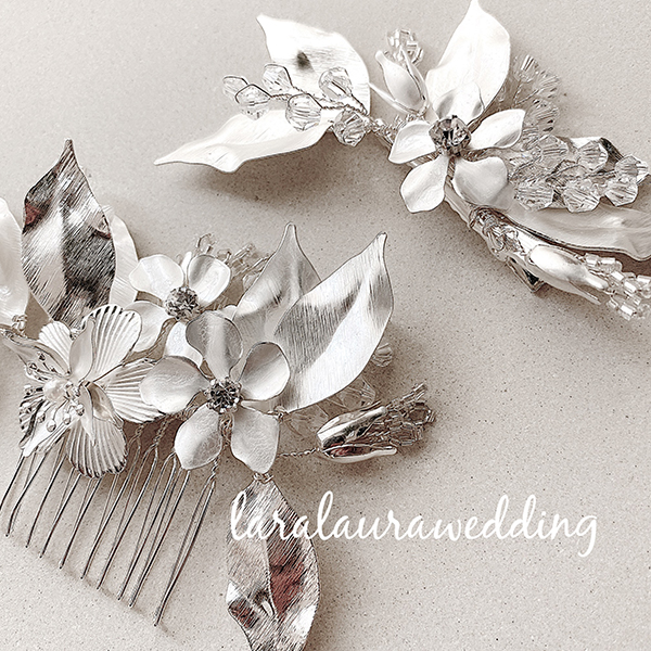 フラワーヘッドドレス。華やかなフラワーと上品なマット加工がポイントのヘッドドレス。2点セットなので繋げたり、左右につけたりとお好きなアレンジに合わせてご着用いただけます。上品ながら華やかさのあるヘッドドレスでトレンドの花嫁に…。
