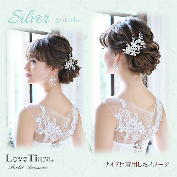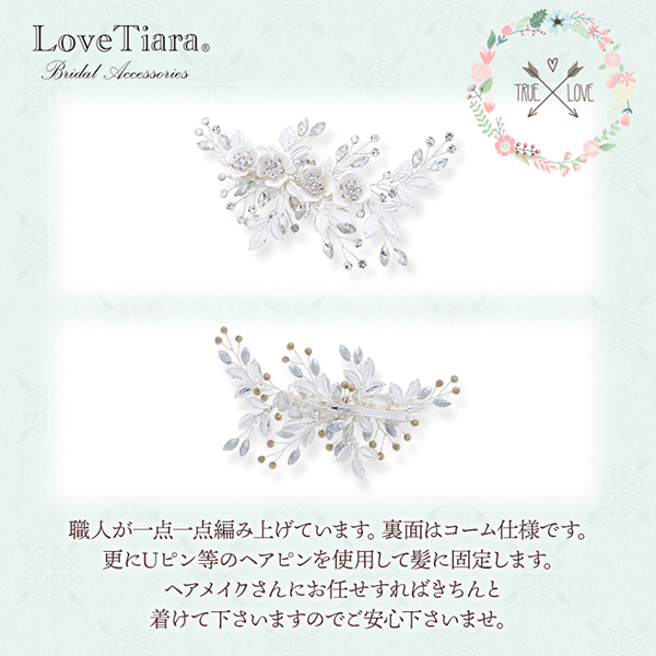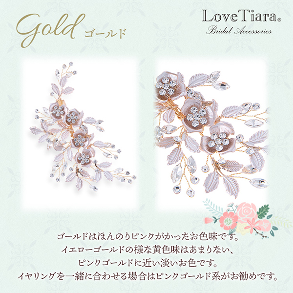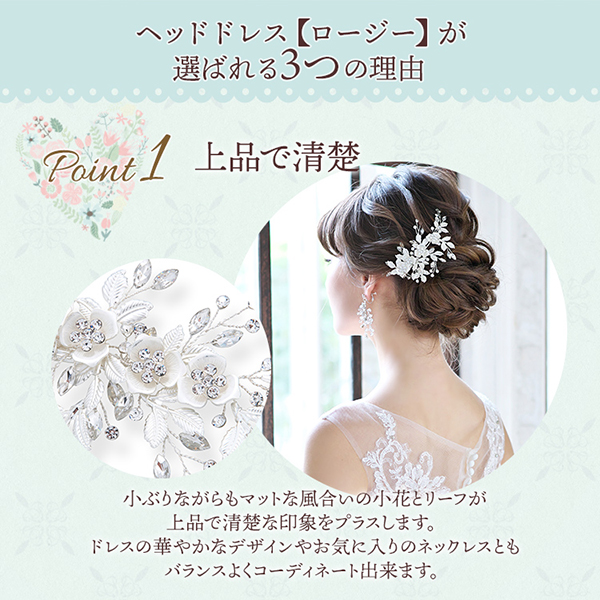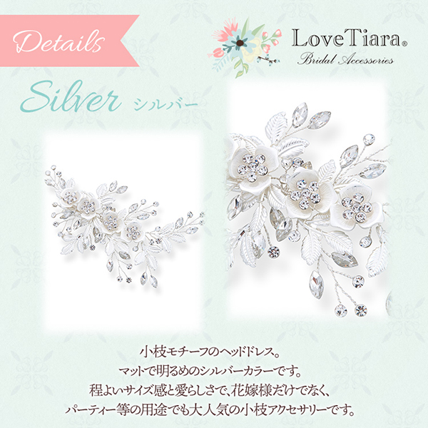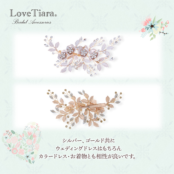 小ぶりながらもマットな風合いの小花とリーフが上品で清楚な印象をプラスします。ドレスの華やかなデザインやお気に入りのネックレスともバランスよくコーディネートできます。