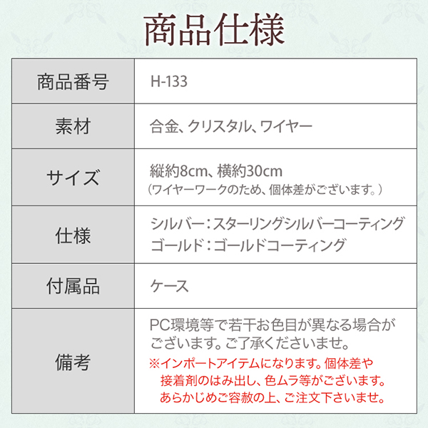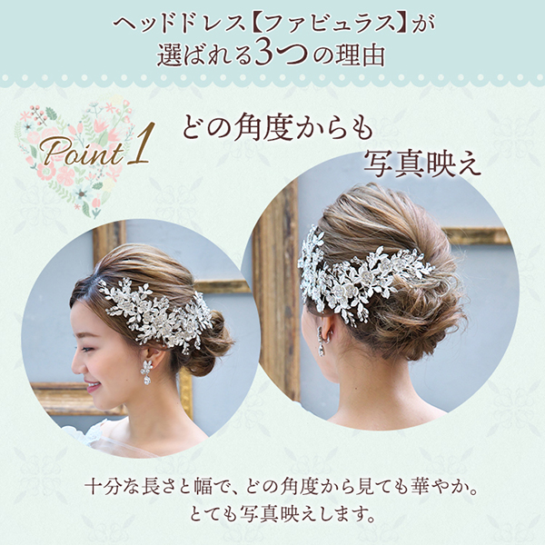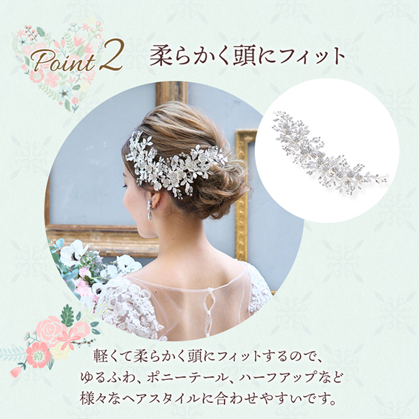 十分な長さと幅で、どの角度から見ても華やか。とても写真映えします。軽くて柔らかく頭にフィットするので、ゆるふわ、ポニーテール、ハーフアップなど様々なヘアスタイルに合わせやすいです。
