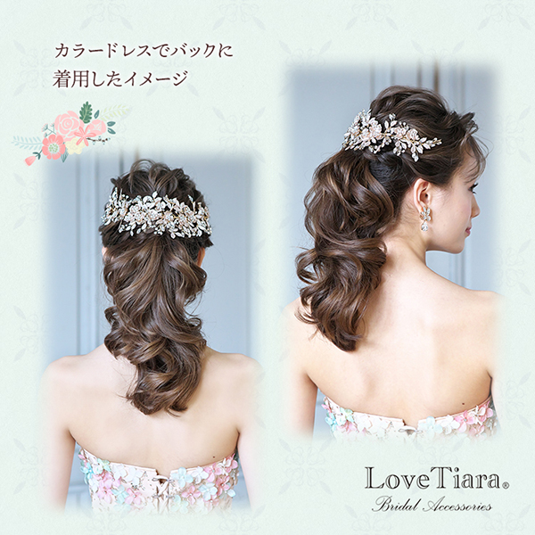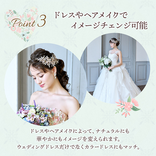 ドレスやヘアメイクによって、ナチュラルにも華やかにもイメージを変えられます。ウェディングドレスだけでなくカラードレスにもマッチ。
