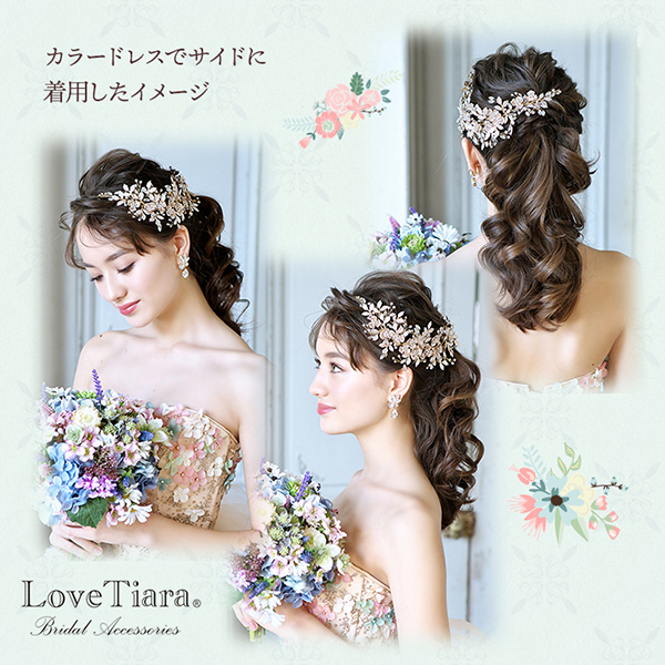 ドレスやヘアメイクによって、ナチュラルにも華やかにもイメージを変えられます。ウェディングドレスだけでなくカラードレスにもマッチ。