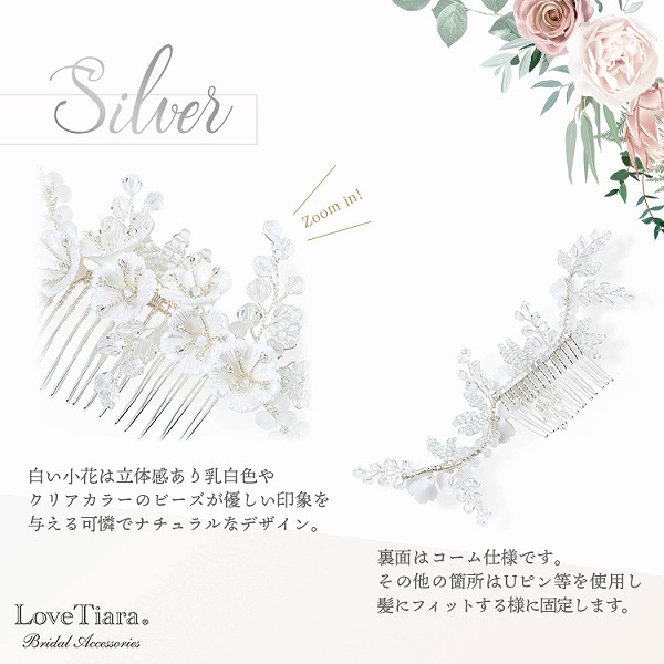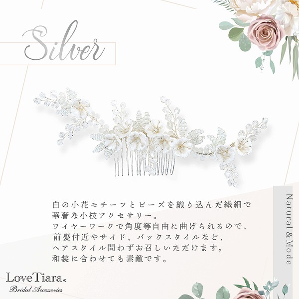 ワイヤーワークで角度等自由に曲げられるので、前髪付近やサイド、バック等お好きな位置で私らしいスタイリングをお楽しみいただけます。洋装だけでなく、和装に合わせても素敵です。お揃いのイヤリング/ピアスもございます。