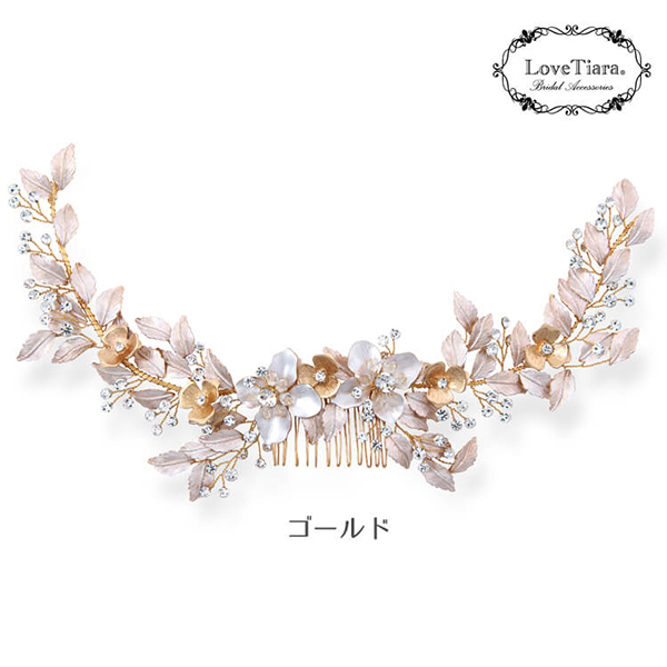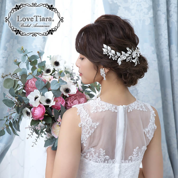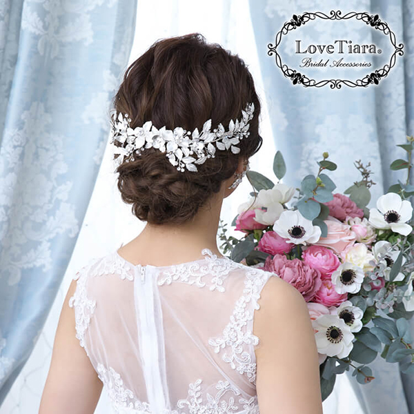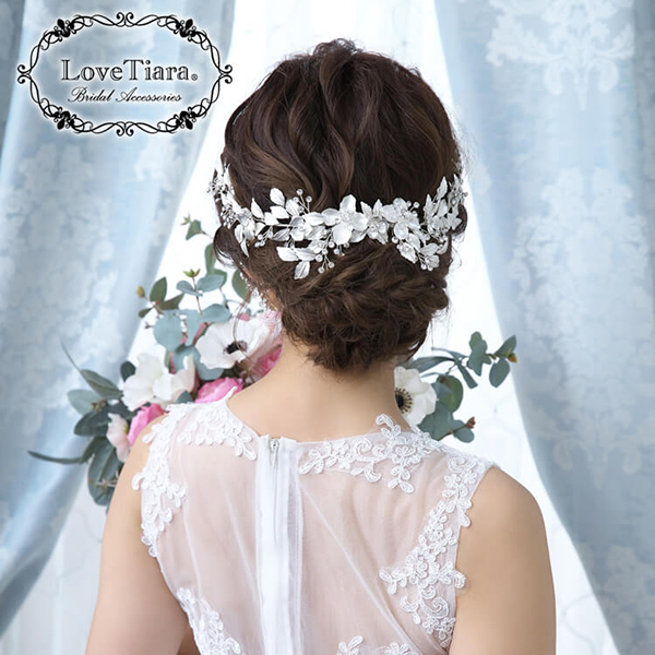 ナチュラルでスタイリッシュな小枝アクセサリー。マットなリーフモチーフにクリスタルとビーズが輝きを添えるヘッドドレスです。横に長いデザインでバックからサイドに掛けて広がるため、どこから見ても写真映えするアイテムです。