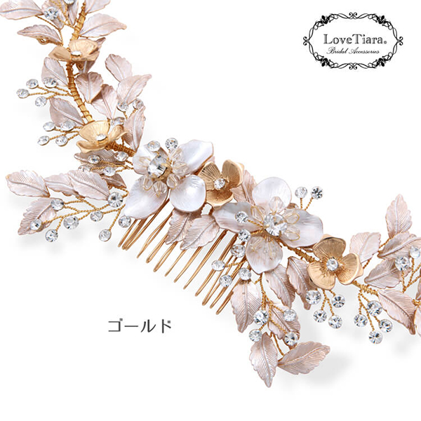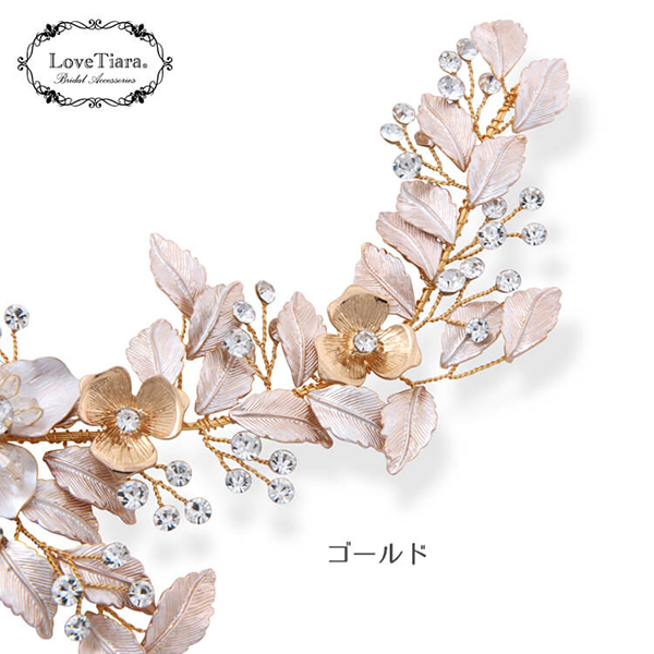 ナチュラルでスタイリッシュな小枝アクセサリー。マットなリーフモチーフにクリスタルとビーズが輝きを添えるヘッドドレスです。横に長いデザインでバックからサイドに掛けて広がるため、どこから見ても写真映えするアイテムです。