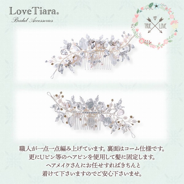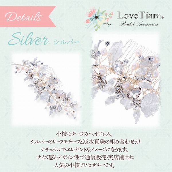 淡水パールとしずく型のクリスタルが程よく煌き、ボリュームのあるリーフモチーフの曲線で魅了するデザイン。トレンドの小枝アイテムの中でもエレガントな印象で、大人なナチュラルさを引き出すヘッドドレスです。ニュアンスを出した挙式ヘアやダウンヘアにも馴染む、ちょうどいいサイズ感。スタイリッシュにもナチュラルにもコーディネートが可能。自然光が煌くリゾートウェディングはもちろん、ホテルウェディングの気品ある空間にもぴったり。ウェディングドレスだけでなく、カラードレスや色打掛にも馴染みます。 裏面はコーム仕様です。Uピン等のヘアピンを使用して髪に固定します。