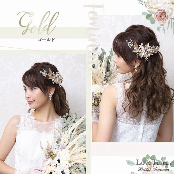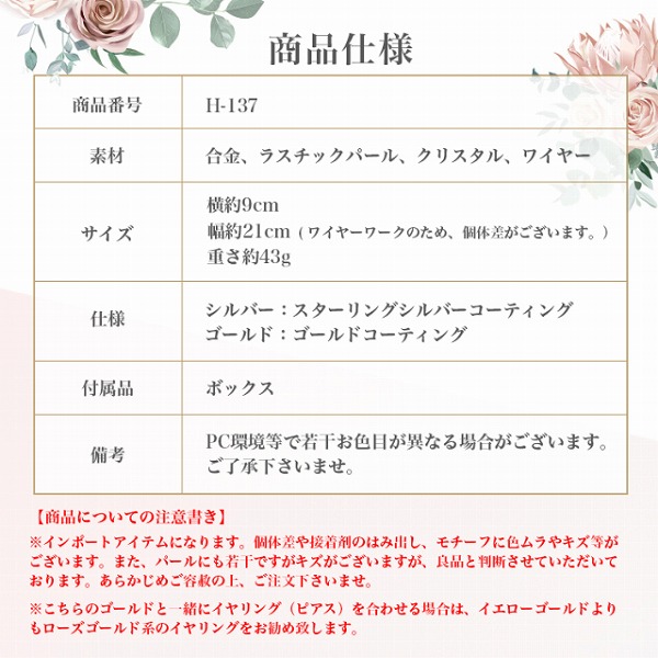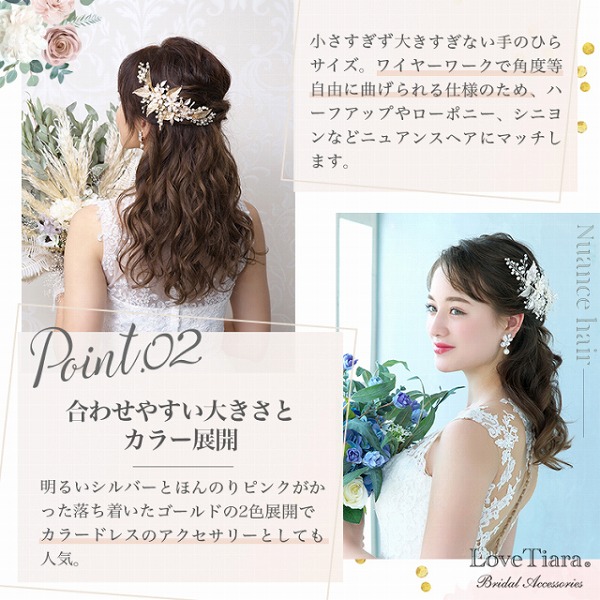 繊細デザインながら抜群の存在感フラワーモチーフと透かし模様のリーフが華やかに編まれ、パールがアクセントになった上品な小枝アクセサリー。ナチュラルかつ優美な姿を演出します。小さすぎず大きすぎない手のひらサイズ。ワイヤーワークで角度等自由に曲げられる仕様のため、 ハーフアップやローポニー、シニョンなどニュアンスヘアにマッチします。合わせやすい大きさでカラードレスのアクセサリーとしても人気。白無垢や色打掛、振袖などのお着物にも◎ニュアンスヘアと合わせれば、かっちりしすぎず、 どこかナチュラルさも感じるを和のコーディネートが叶います。