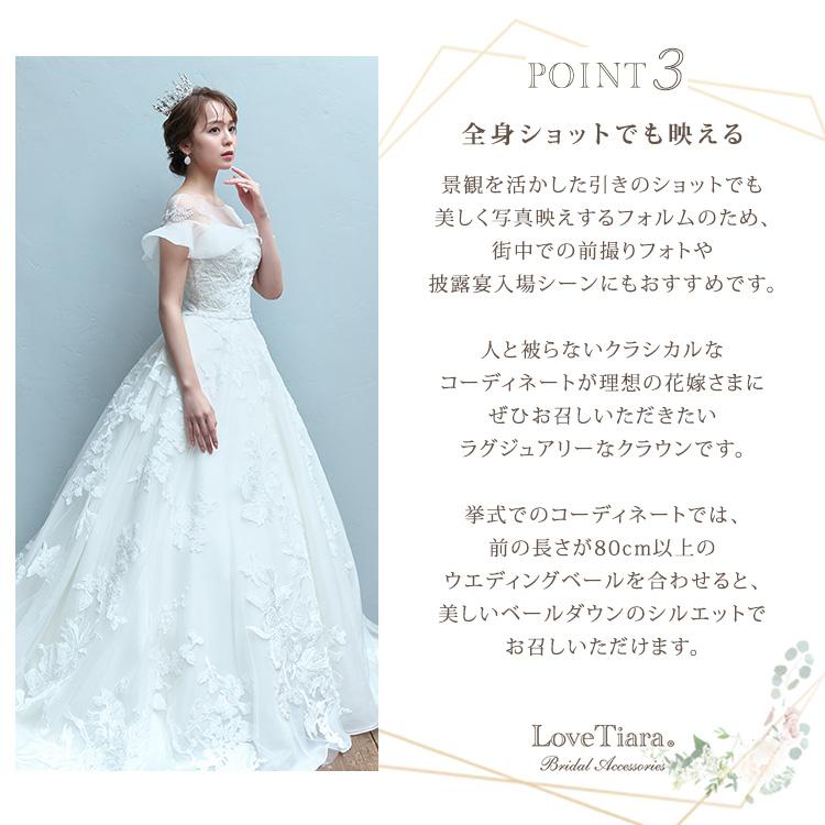 どの角度から見ても華やかなロイヤルデザイン。ホテルや大聖堂などラグジュアリーな空間にもマッチします。景観を活かした引きのショットでも美しく写真映えするフォルムのため、街中での前撮りフォトや披露宴入場シーンにもおすすめです。後ろ姿までエレガントな花嫁姿になり、ゴージャスなドレスにも引けを取らないウェディングアイテムです。