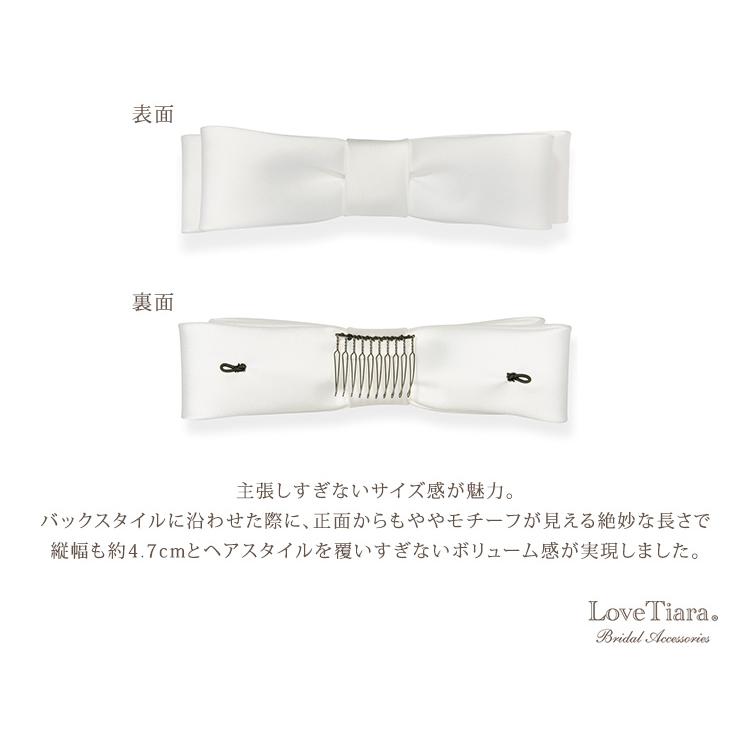 光沢のないマットなサテン生地がキュートなモチーフがクラシカルさを引き出します。主張しずぎないサイズ感は、お好きな位置であなたらしさを演出し、正統派からフェミニンまでコーディネート自在。かっちりしすぎない王道のリボンボンネは、披露宴から2次会までシーンを問わずスタイリングが叶います。愛らしいシルエットで上品さも引き出したい花嫁様におすすめのウェディングアイテムです。