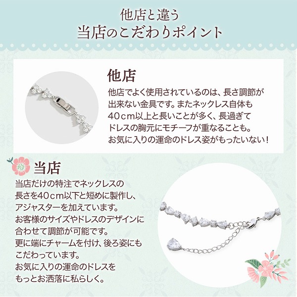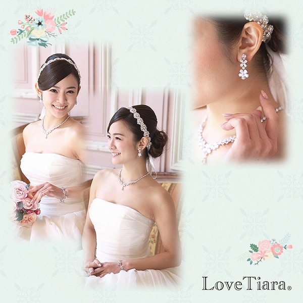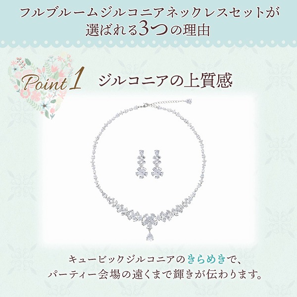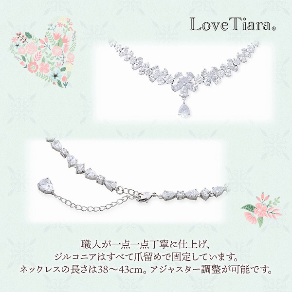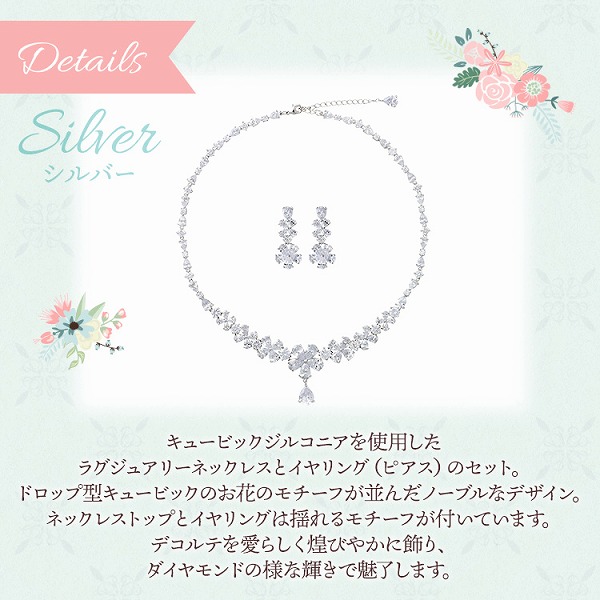 ネックレス、イヤリング共にフラワーモチーフを散りばめた愛らしく、大人可愛いデザイン。更に上品さも兼ね備えていて、幸福感に満ちた花嫁様にぴったり。挙式後もパーティーや、 デイリーでイヤリングのみ着用したりと幅広く ご利用いただけます。キュービックジルコニアを私用したラグジュアリーネックレスとイヤリングのセット。ドロップ型キュービックのお花のモチーフが並んだノープルなデザイン。ネックレストップとイヤリングは揺れるモチーフが付いています。デコルテを愛らしく煽ぴやかに飾り、ダイヤモンドの様な輝きで魅了します。