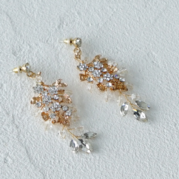 優しいゴールドカラーのリーフとラインストーンのお花が散りばめられたリーフ型の小枝ピアス。程よいラインストーンのキラキラ感もありでナチュラルですが、ナチュラルになり過ぎず上品な感じに演出。