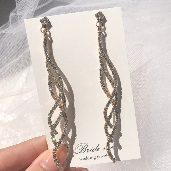 ヘッドドレスやネックレスも邪魔にならない上品なデザインのクリスタルストーンのピアスです。エレガントなゴールドのラインストーンが存在感たっぷり!どんなドレスとの相性も抜群!優雅に揺れるロングピアスはドレッシーなアクセサリーピアスです。ブライダルやパーティーなどのフォーマルシーンにぴったり、美しく煌くゴージャスなデザインのピアスは上品でドラマティックな存在感を放ちます。