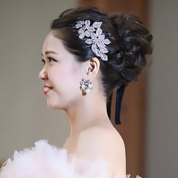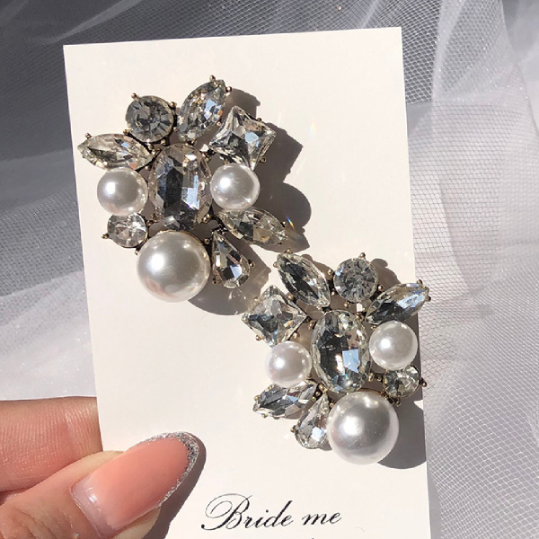 シンプルなドレスから刺繍など入ったクラシカルなドレスまで、どんなドレスにも合わせられるクリスタルストーンとパールのブライダルアクセサリーには、大ぶりで存在感がある豪華なビジューと清楚なパールを敷き詰めた煌めきが大人なピアス。ダイヤモンドのような輝きがあり、光が反射してキラキラとても綺麗です。パールをあしらい、より女性らしいく華やかな上品さを兼ね備えております。太陽や照明にあたるとカットした面のプリズム効果でクリスタルビジューの輝きがとても美しいピアスです。