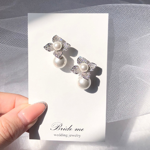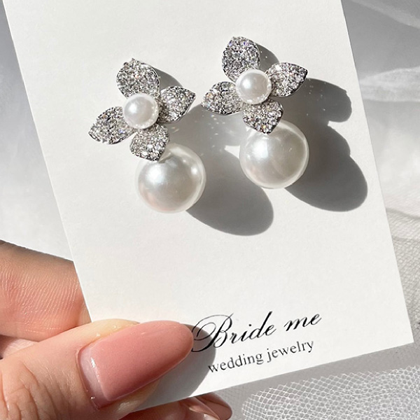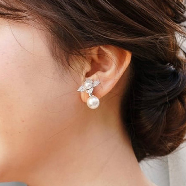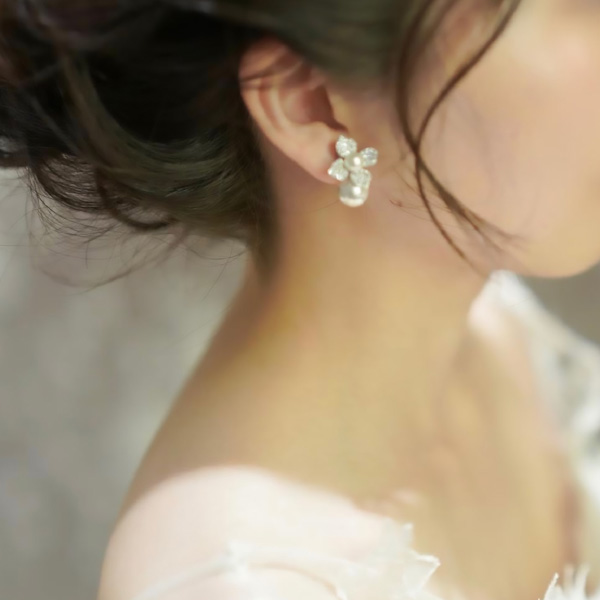 存在感のある人気のキュービックジルコニアとエレガントな大ぶりのパールの組み合わせでとても豪華に仕上げたお花とパールの清楚なデザインのアクセサリーです。華やかなデザインでどんなドレスにもコーディネートのポイントとなるアクセサリーです。可憐なサイズ感と上品なお花モチーフがグッドバランスのピアス。花びら一枚一枚に輝きをちりばめたデザインはエレガントできちんと感もあるピアスです。、ウエデイィングはもちろん上品にまとめたい時や、パーティースタイルにもおすすめです。