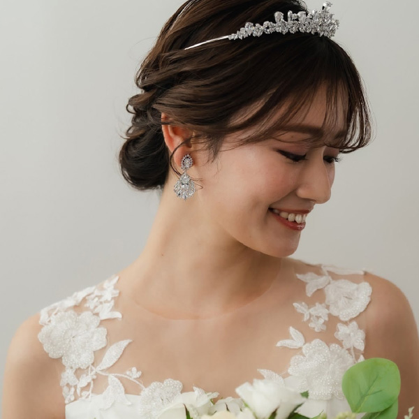 大きめのドロップ型のモチーフが、エレガントで上品な雰囲気を演出してくれる、王道デザインのアクセサリーです。ジルコニアは人口ダイヤモンドと呼ばれるほど美しい輝きを放ち、どの角度からみても美しい輝きを放つよう計算されたデザインはお顔回りを華やかに見せてくれます。遠くにいるゲストもうっとりするような、ラグジュアリーなデザインが目を惹きます。