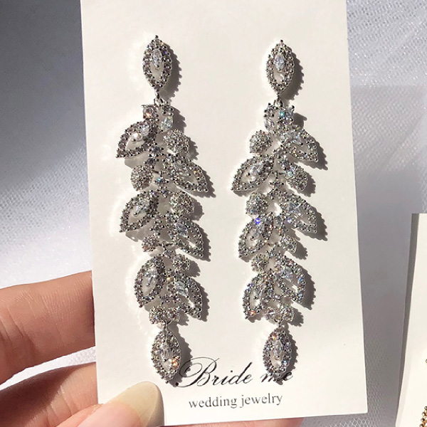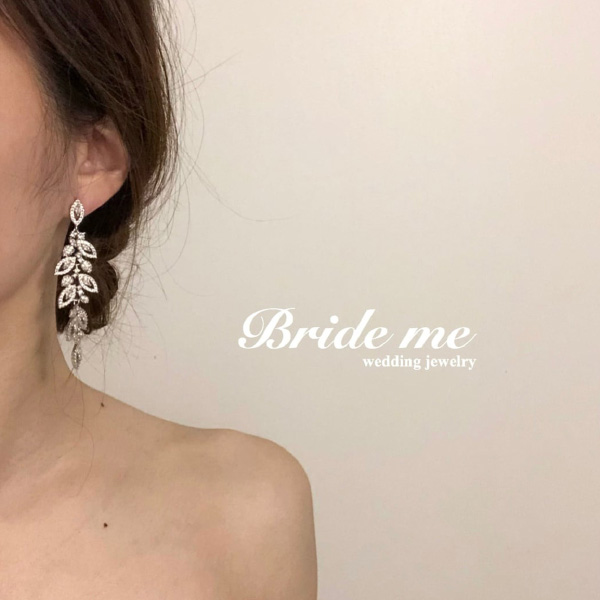 リーフをモチーフにしたシルバーのアクセサリーです。可愛らしいデザインですが、縦長のシルエットで甘すぎない印象です。ティアラやシルバー系のヘッドアクセサリーとの相性も良いです。可愛らしくもゴージャスなデザインが目を惹くアクセサリーです。