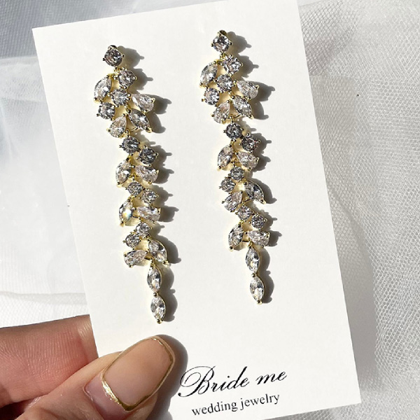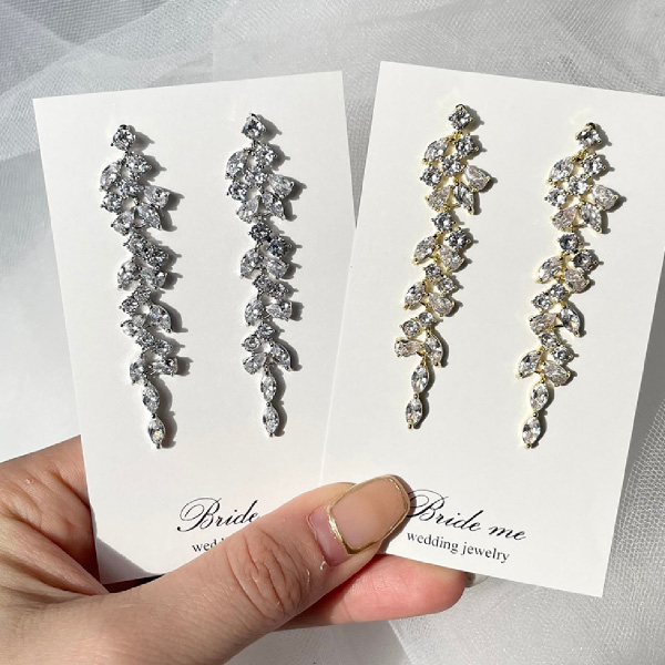 小さめにカットされたジルコニアの縦長ラインが美しい、ゴールドのアクセサリーです。主張しすぎないデザインなので、さりげなくキラッと輝き、花嫁様の横顔を美しく見せてくれます。繊細で華奢な雰囲気のアクセサリーは、ナチュラルウェディングにピッタリのアイテムです。ウェディングはもちろん、ちょっとしたパーティやお呼ばれにも活躍するアクセサリーです。